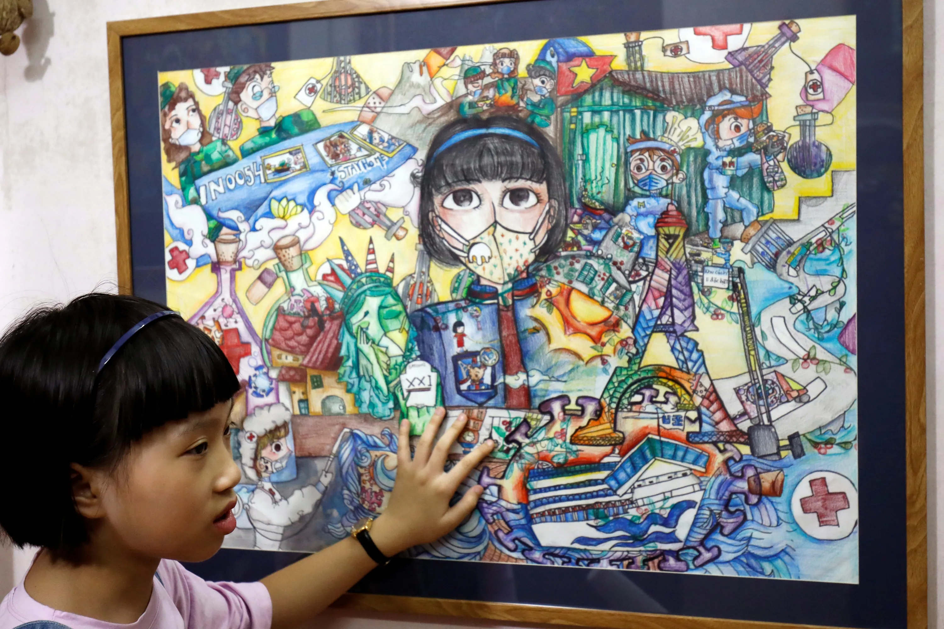 Nguyen Doi Chung Anh, 10, a Vietnamese school girl stands next to her painting about the coronavirus disease (COVID-19) at home in Hanoi, Vietnam on June 10, 2020. (Photo by Kham via Reuters)