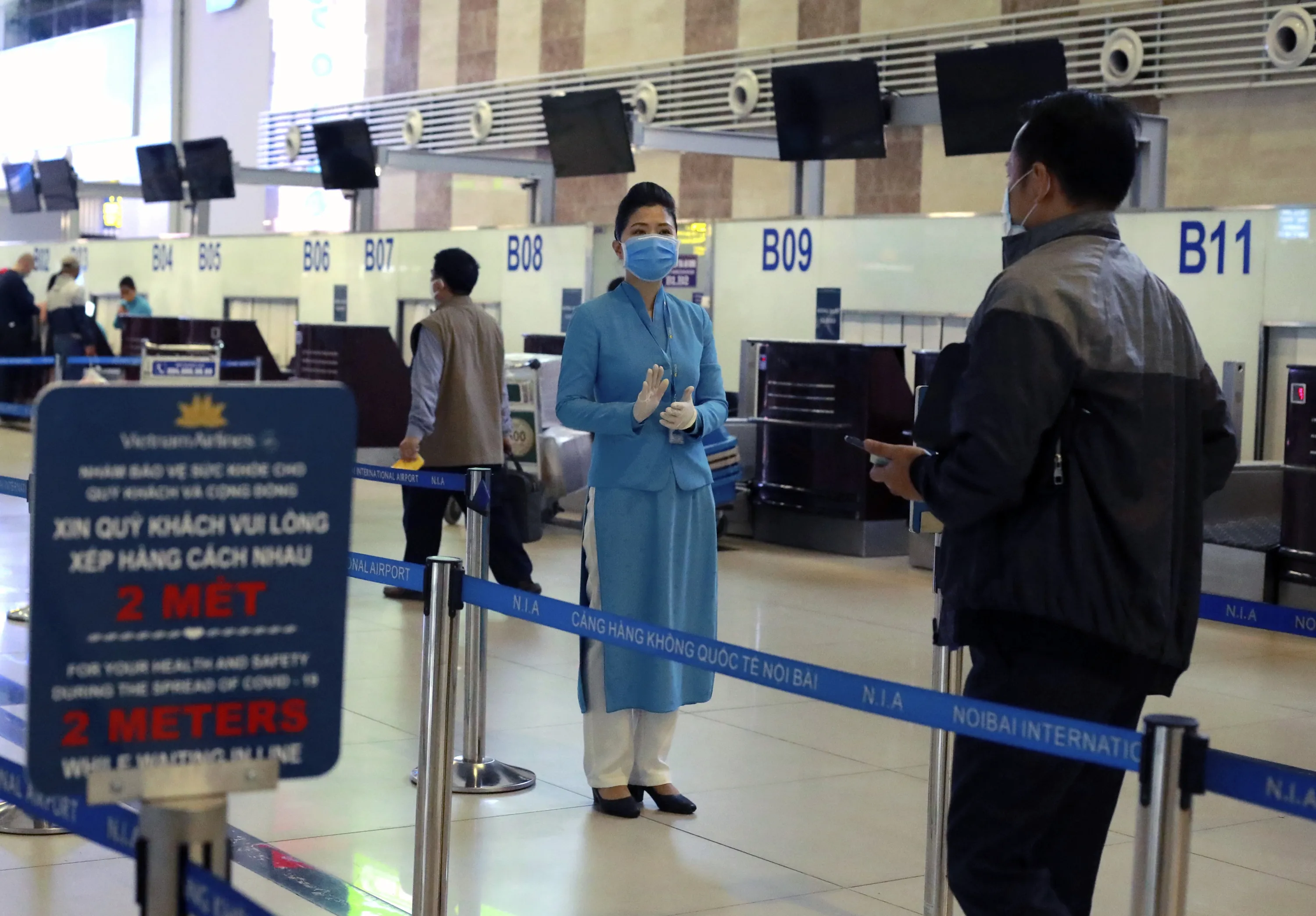 An airline staff instructs passengers to check in at Hanoi airport, Vietnam on Thursday, May 7, 2020. Vietnam on Thursday reported 17 new imported cases of COVID-19 as the country organizes more chartered flights bringing back stranded citizens home. (Photo by Hau Dinh/AP Photo)