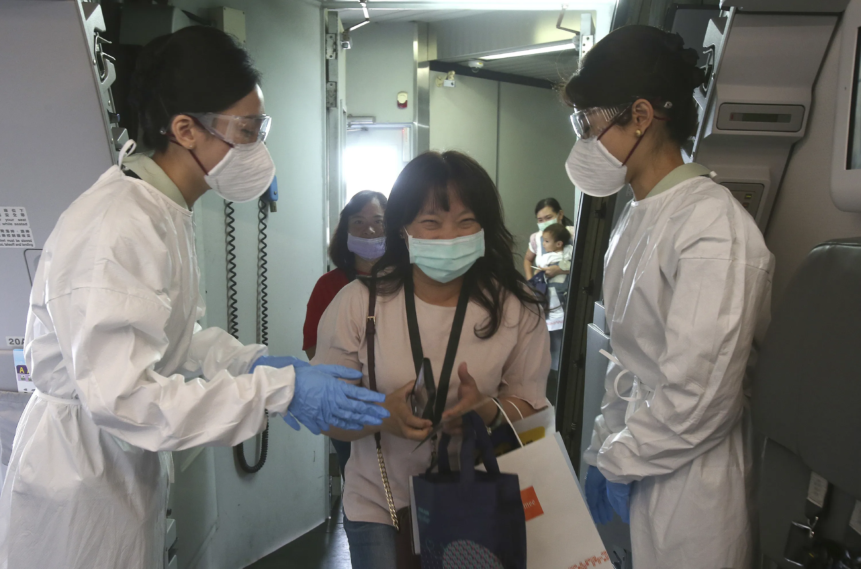 Participants are greeted by flight attendants in protective suits during a mock trip abroad at Taipei Songshan Airport in Taipei, Taiwan, Tuesday, July 7, 2020. Dozens of would-be travelers acted as passengers in an activity organized by Taiwan’s Civil Aviation Administration to raise awareness of procedures to follow when passing through customs and boarding their plane at Taipei International Airport. (Photo by Chiang Ying-ying/AP Photo)