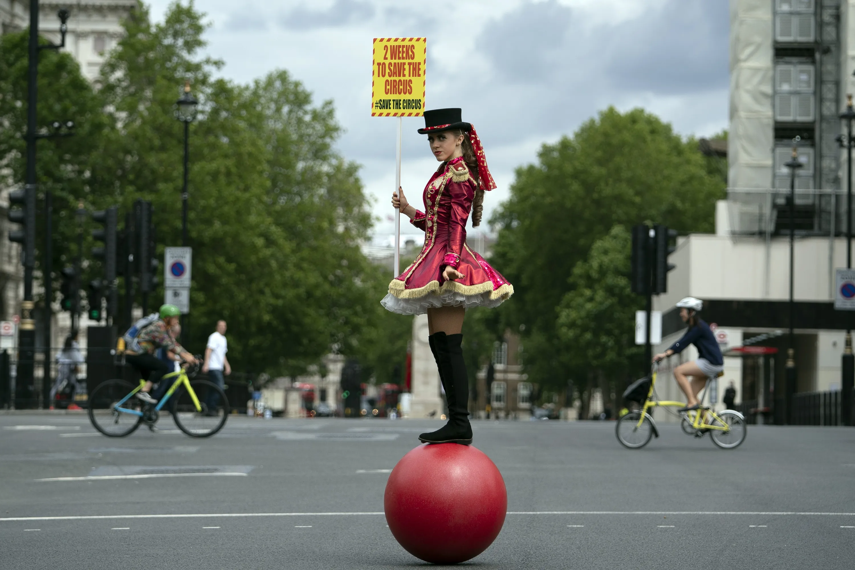 Circus performer from the Association of Circus Proprietors on Whitehall, London, Britain, 07 July 2020. The association handed a petition to Downing Street to ask British Prime Minister Boris Johnson to allow circuses to reopen. (Photo by Will Oliver/EPA/EFE)
