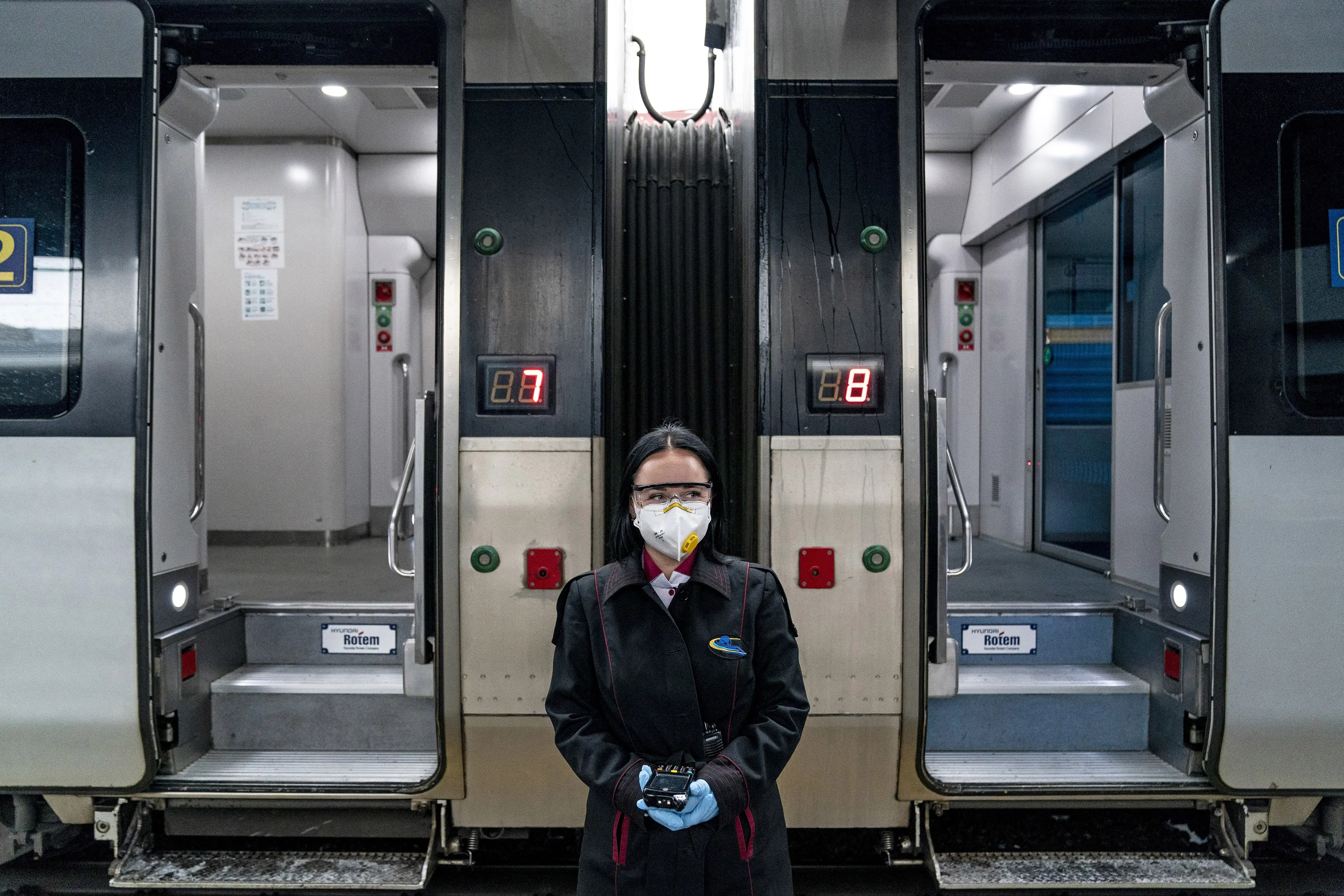 A train conductor waits for a passengers at the train station in Kyiv, Ukraine, on Monday, June 1, 2020. Ukraine continued to ease its coronavirus restrictions Monday, lifting a ban on intercity travel and allowing gyms and swimming pools to reopen. (Photo by Evgeniy Maloletka/AP Photo)