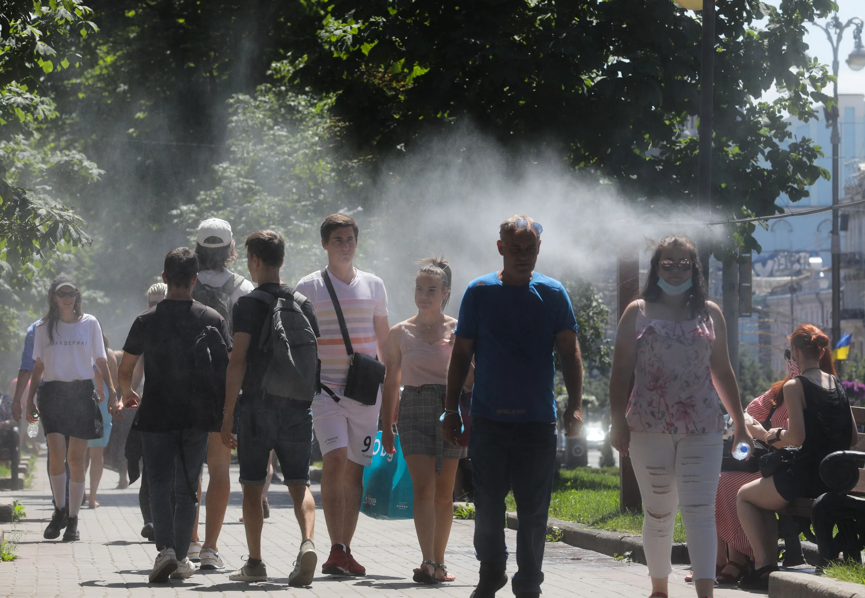 People walk through the mist made to cool people in gardens during hot summer weather in downtown Kyiv, Ukraine, June 27, 2020. Ukraine appeared on the WHO list of countries with a high rate of COVID-19 spread. The list also includes Albania, Azerbaijan, Bosnia and Herzegovina, Armenia, Northern Macedonia, Kazakhstan, Kyrgyzstan, Kosovo, Moldova and Sweden. (Photo by Sergii Kharchenko/NurPhoto via Getty Images)