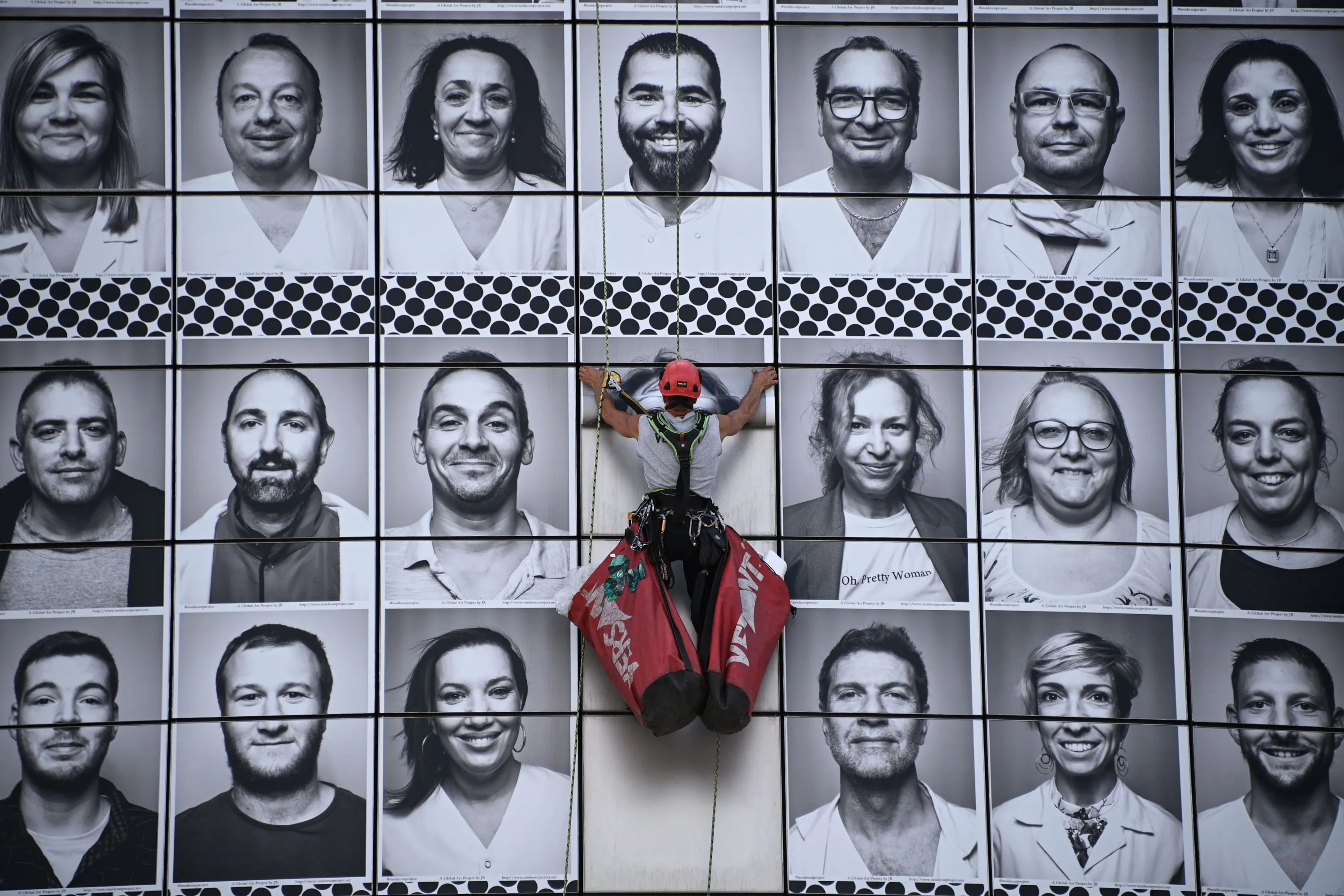 A worker pastes portraits of healthcare workers created on the facade of the Opera Bastille, at the initiative of the collective #ProtegeTonSoignant to pay tribute to caregivers in first ligne during the Covid-19 epidemic, in Paris, on July 8, 2020. (Photo by Anne-Christine Poujoulat/AFP Photo)