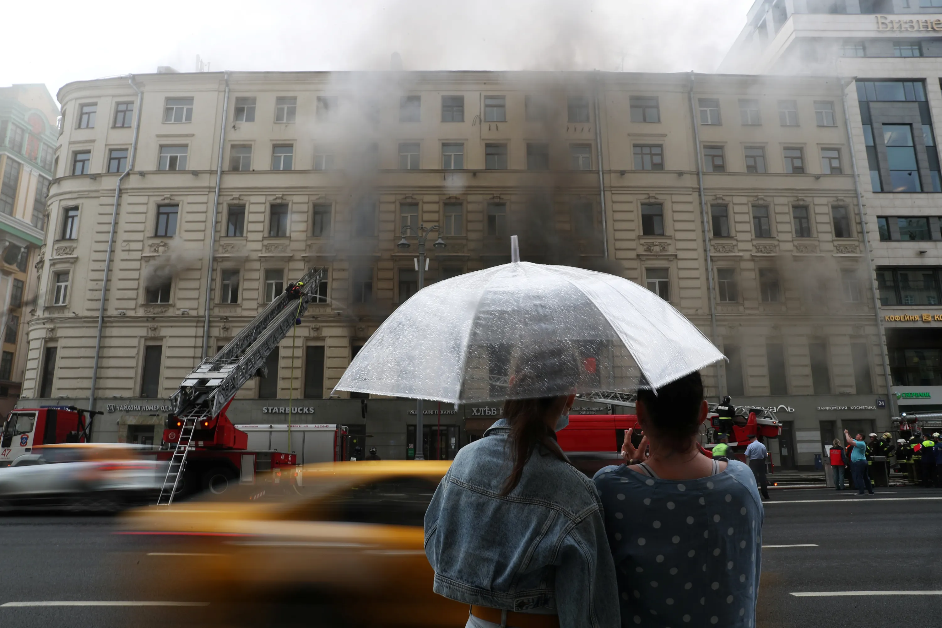 People watch as firefighters work to extinguish a fire at a building in central Moscow, Russia on July 2, 2020. (Photo by Evgenia Novozhenina/Reuters)