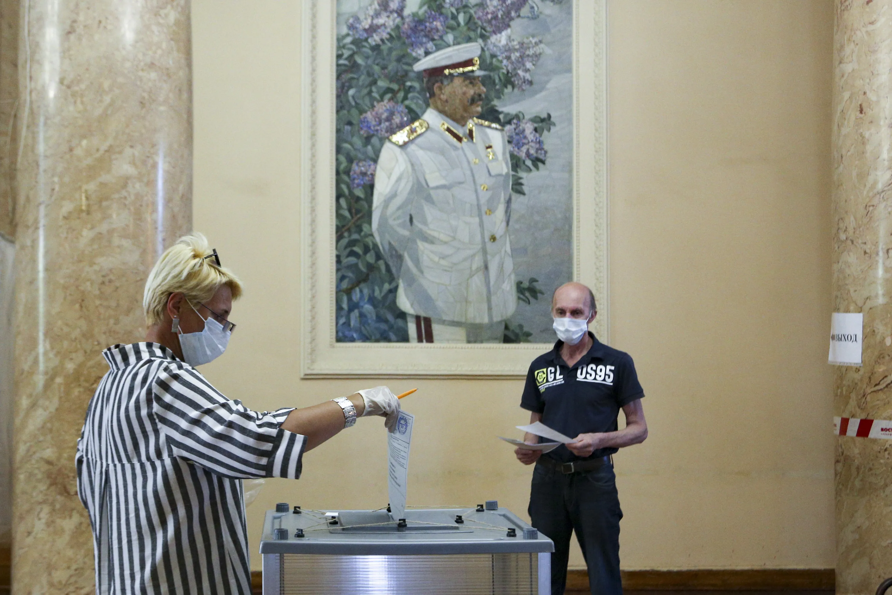 A woman, wearing a face mask and gloves to protect against coronavirus and observing social distancing guidelines, casts her ballot at a polling station with a portrait of former Soviet leader Josef Stalin on the wall in Volgograd, former Stalingrad, Russia, Wednesday, July 1, 2020. The vote on the constitutional amendments that would reset the clock on Russian President Vladimir Putin's tenure and enable him to serve two more six-year terms is set to wrap up Wednesday. (Photo by Dmitry Rogulin/AP Photo)