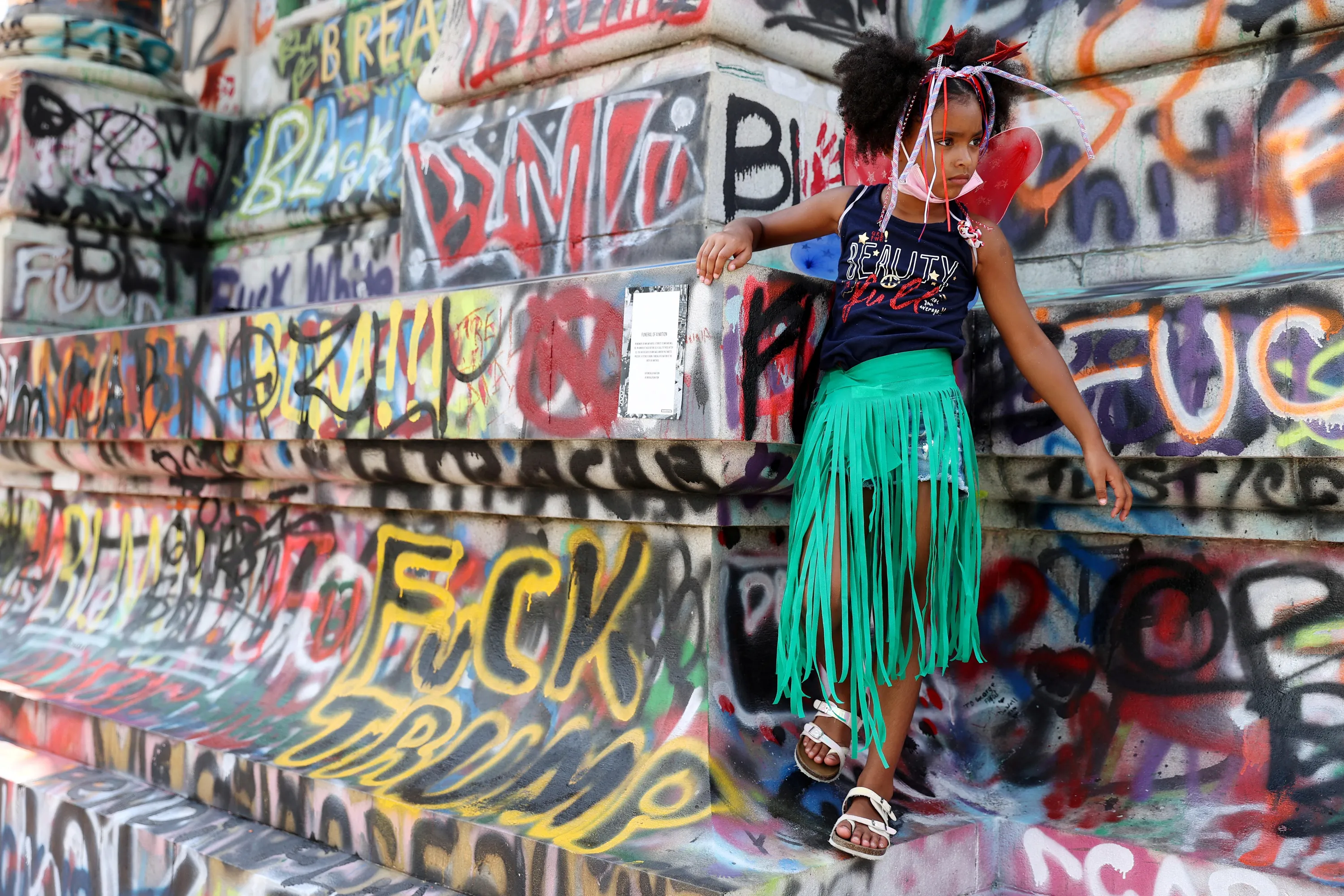 Brooklyn Heckstall, age 7 years, stands on the Robert E. Lee Monument after her parents took her picture, as people gather on the July 4th holiday at the statue in Richmond, Virginia, U.S. July 4, 2020. (Photo by Jonathan Ernst/Reuters)
