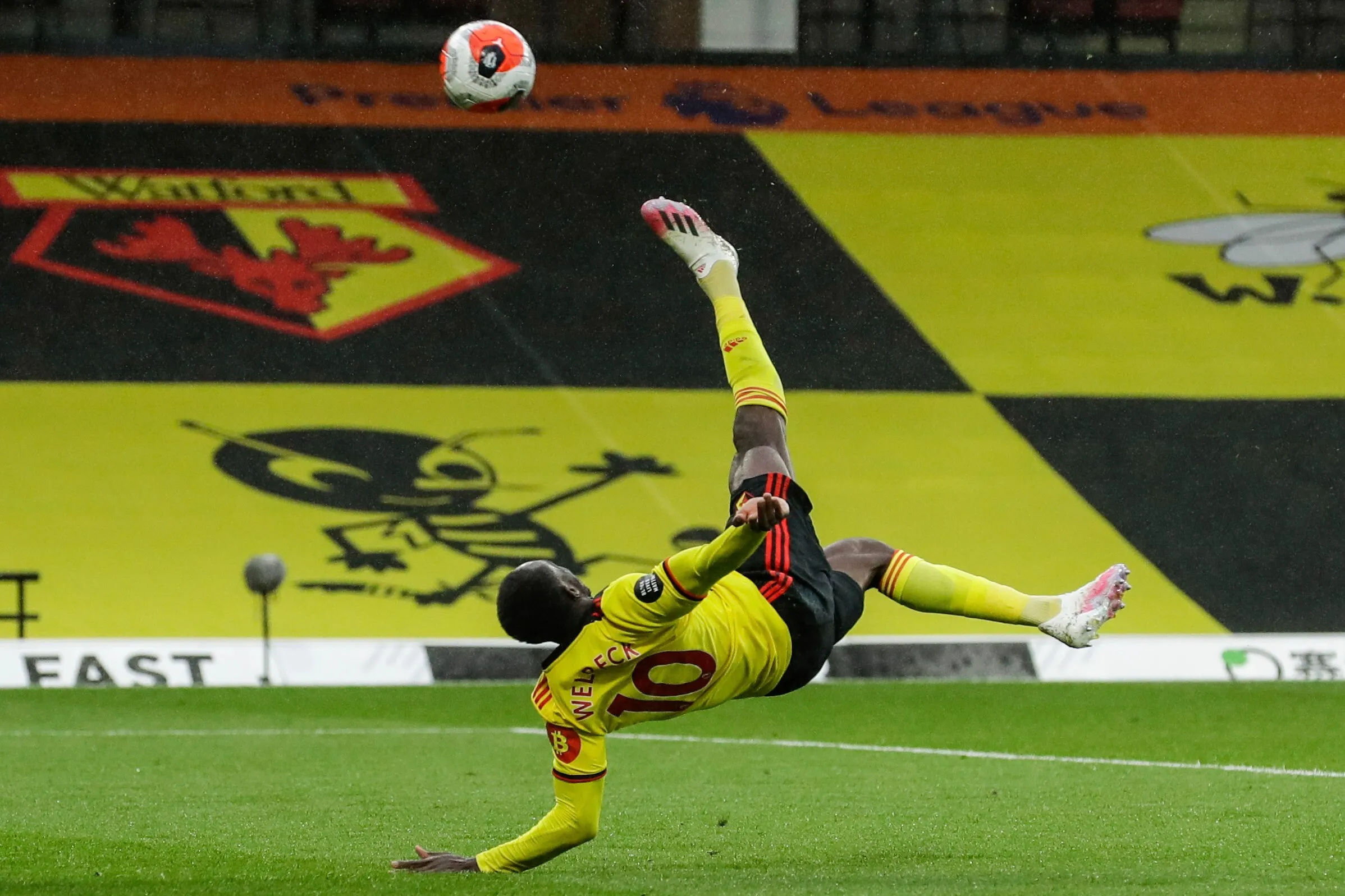 Walford's Danny Welbeck scores his team second goal during the English Premier League soccer match between Watford and Norwich City at the Vicarage Road Stadium in Watford, England, Tuesday, July 7, 2020. (Photo by Matt Dunham/AP Photo/Pool)
