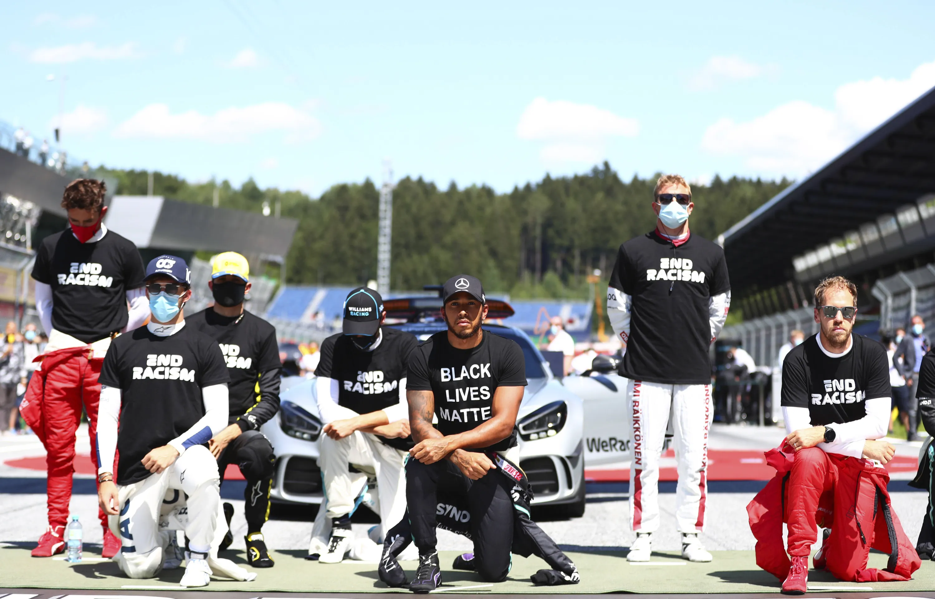 Drivers take a knee n support of the Black Lives Matter movement before the Austrian Formula One Grand Prix race at the Red Bull Ring racetrack in Spielberg, Austria, Sunday, July 5, 2020. (Photo by Dan Istitene/Pool via AP Photo)