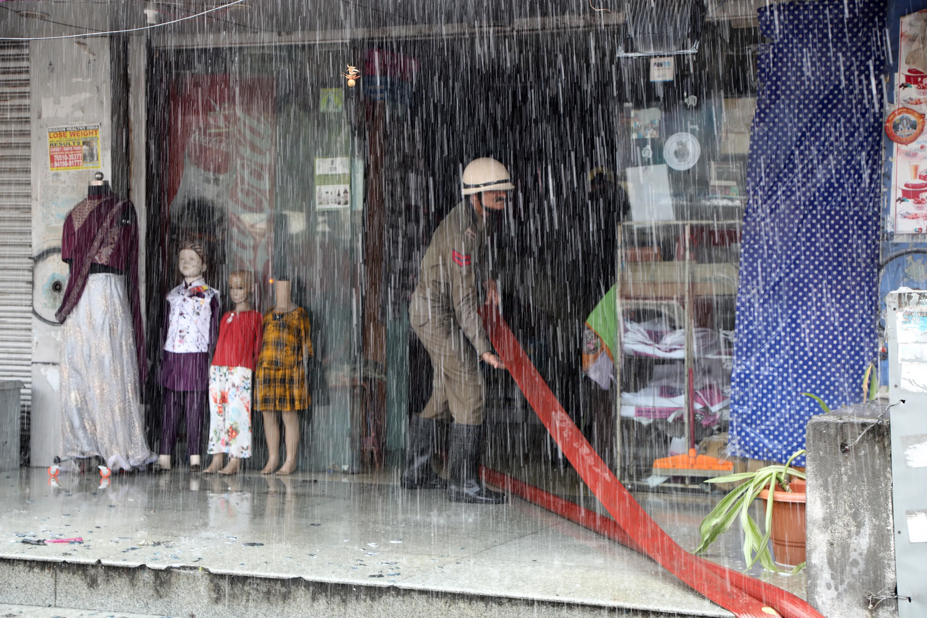 Indian firefighters try to extinguish flames after a fire broke out at a shopping mart in Jammu, India, 10 July 2020. According to police and media reports, around 30 fire engines engaged to douse the flames which have spread to all the three floors of Vishal Mega Mart shopping complex near Government hospital. No casualties have been reported in the incident so far. (Photo by Jaipal Singh/EPA/EFE)
