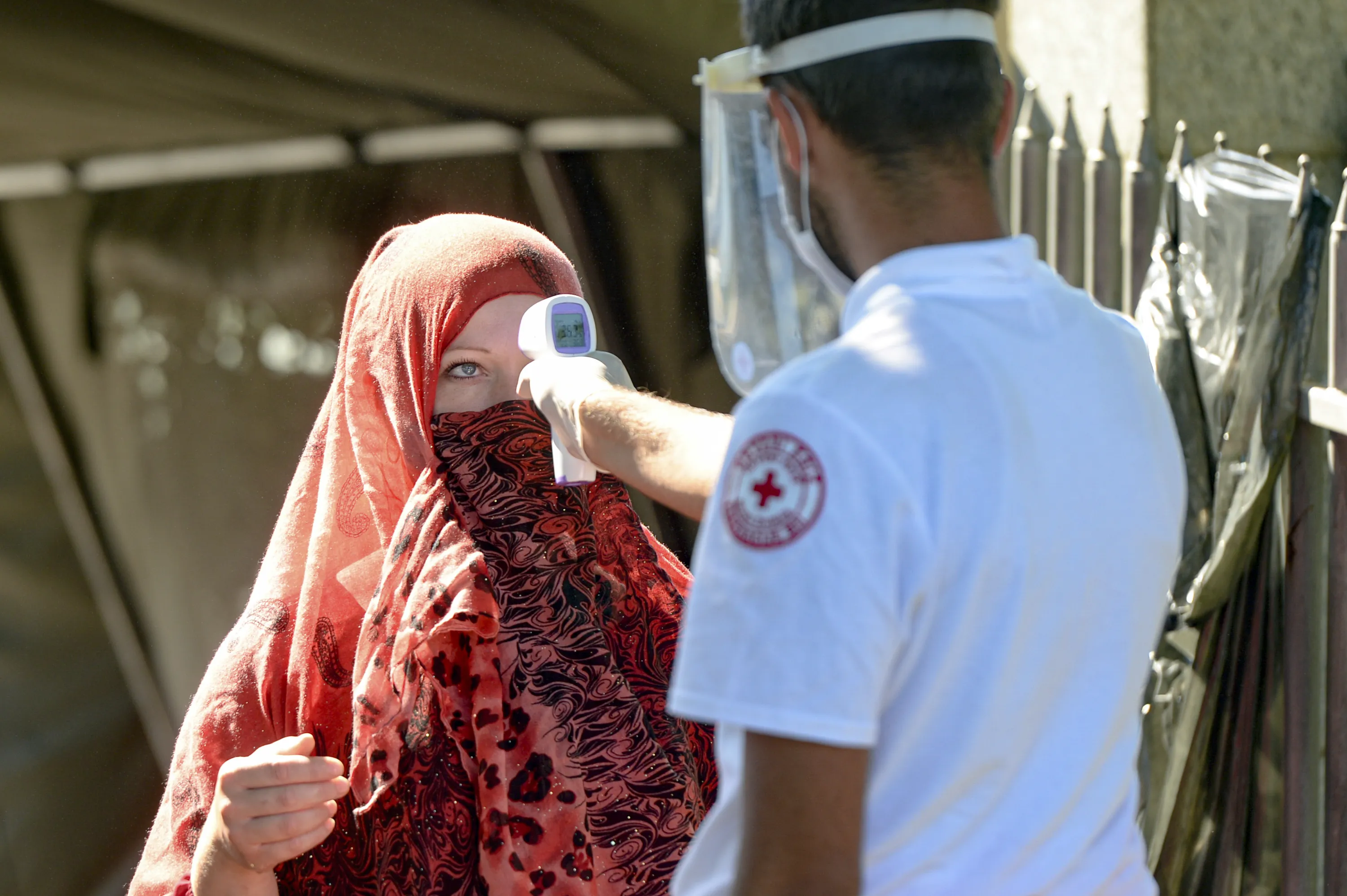 A health worker measures the temperature of a woman before granting her access to the memorial cemetery in Potocari, near Srebrenica, Bosnia, Saturday, July 11, 2020. Nine newly found and identified men and boys were laid to rest as Bosnians commemorate 25 years since more than 8,000 Bosnian Muslims perished in 10 days of slaughter, after Srebrenica was overrun by Bosnian Serb forces during the closing months of the country's 1992-95 fratricidal war, in Europe's worst post-WWII massacre. (Photo by Kemal Softic/AP Photo)