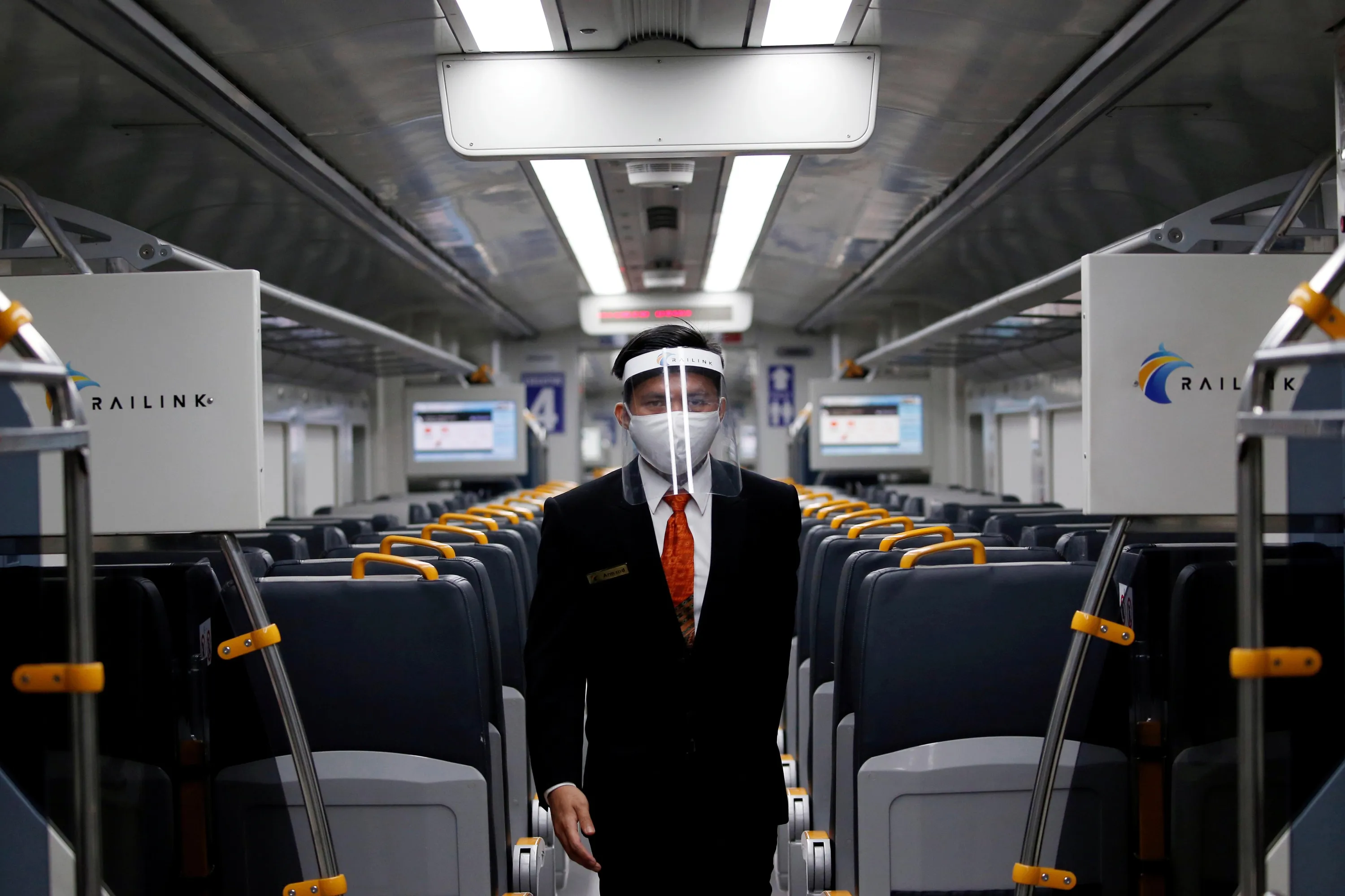 An employee wearing a protective mask and face shield walks inside a Railink train after the government eased restrictions following the coronavirus disease (COVID-19) outbreak in Jakarta, Indonesia, July 2, 2020. (Photo by Willy Kurniawan/Reuters)