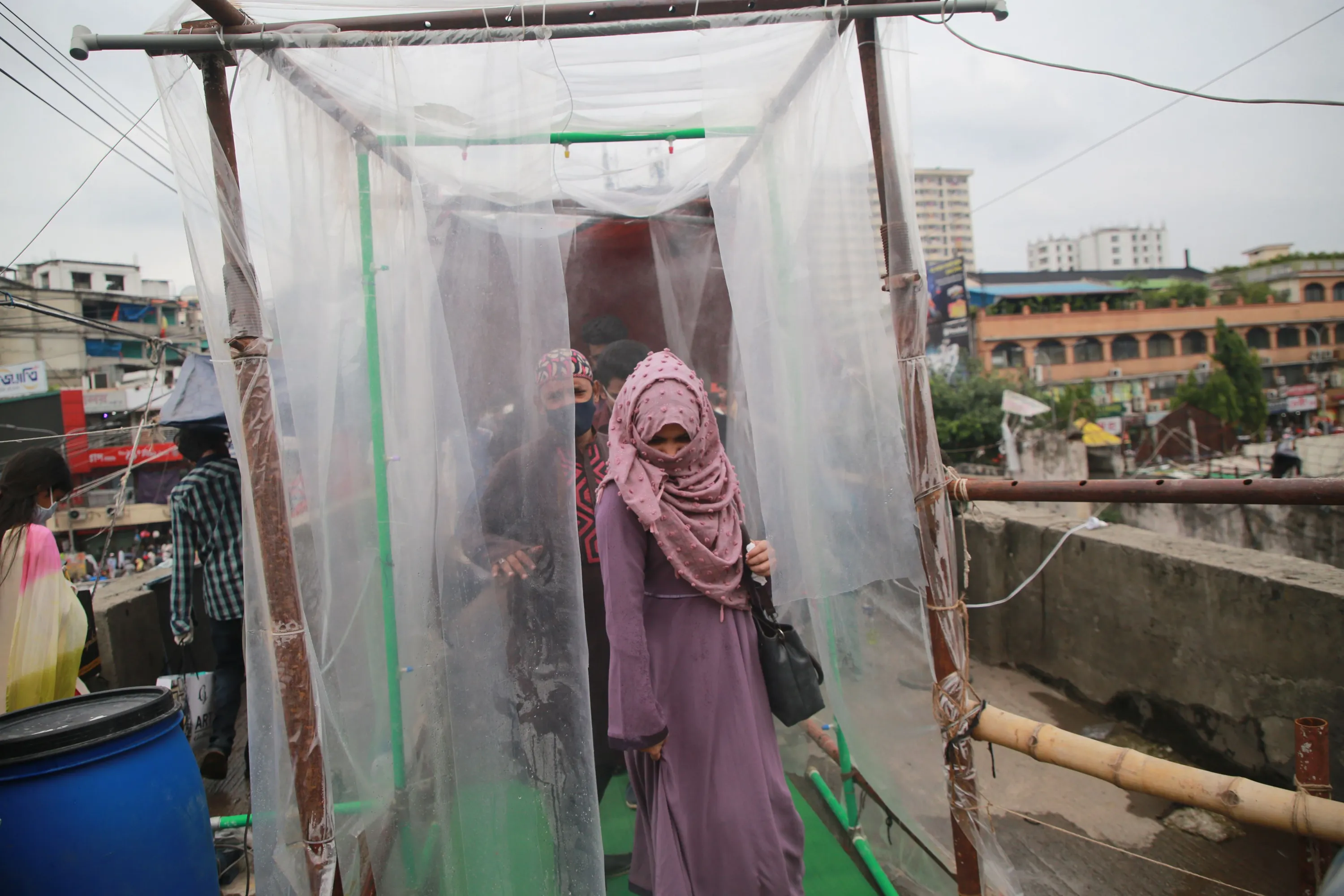 People going through a disinfection chamber in front of a shopping Mall to buy clothes ahead of the Eid-Al-Fitr festival which is marks end of the Islamic holy month of Ramadan, during a lockdown following the COVID-19 coronavirus outbreak in Dhaka, Bangladesh on May 22, 2020. (Photo by Rehman Asad/NurPhoto via Getty Images)