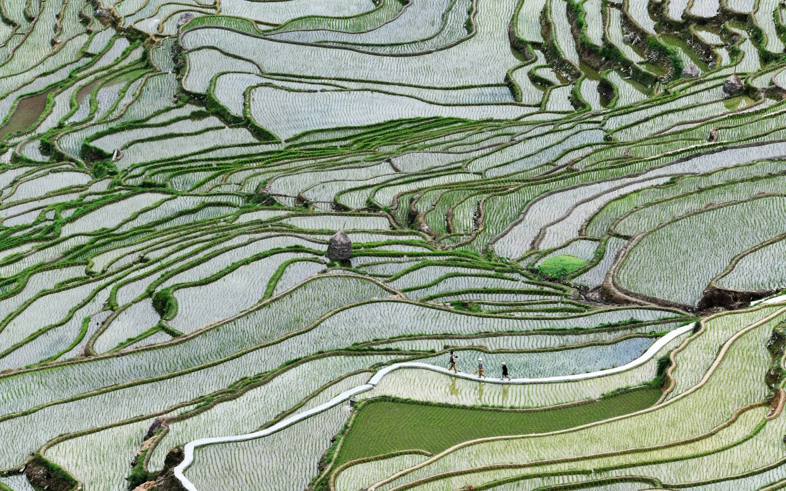 Photo taken on May 26, 2020 shows villagers walking in terraced fields in Jiabang Township, Congjiang County of southwest China's Guizhou Province. (Photo by Yang Wenbin/Xinhua News Agency)