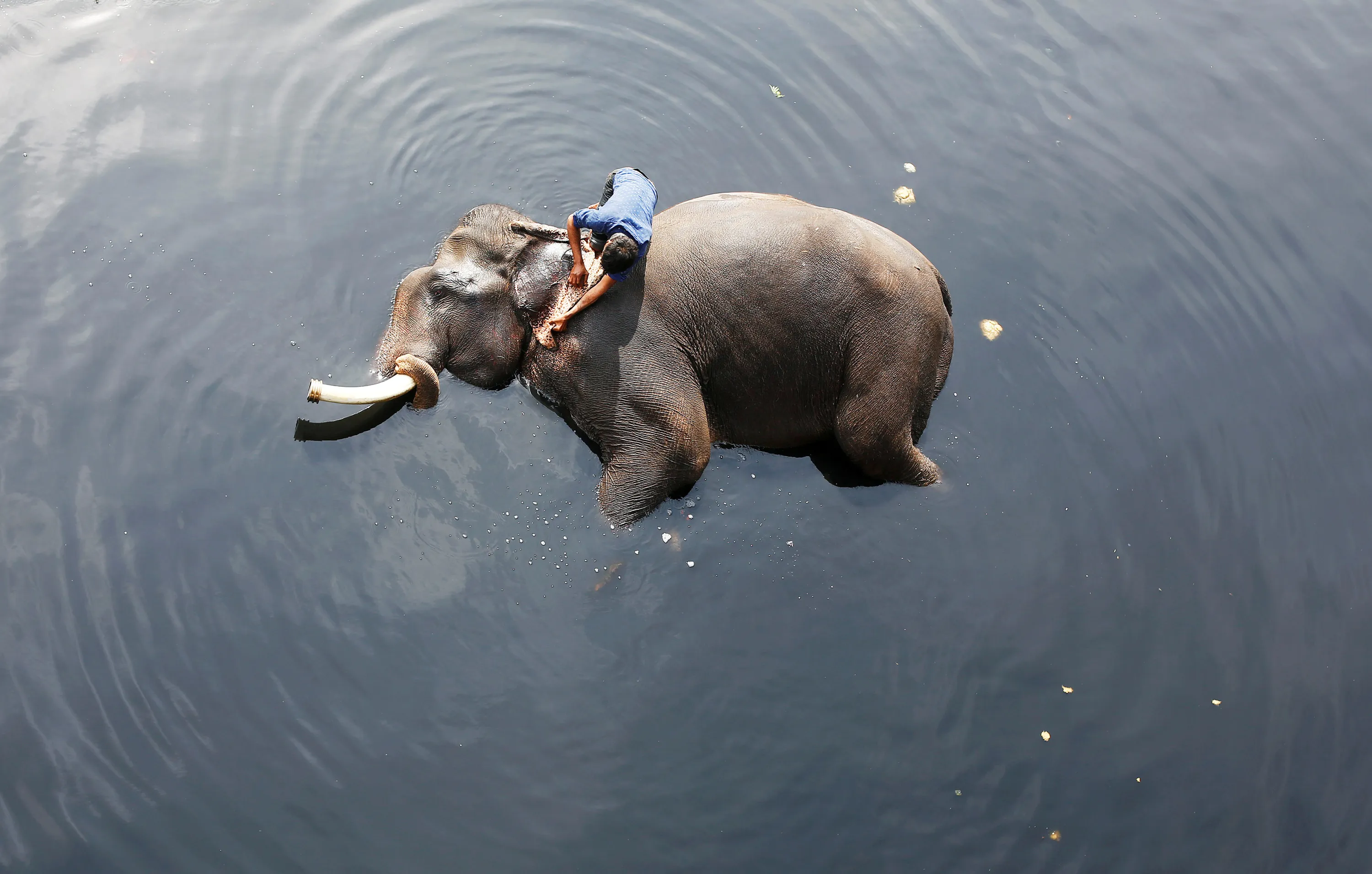 A mahout bathes his elephant in the polluted water of river Yamuna in New Delhi, India on February 6, 2018. (Photo by Adnan Abidi/Reuters)