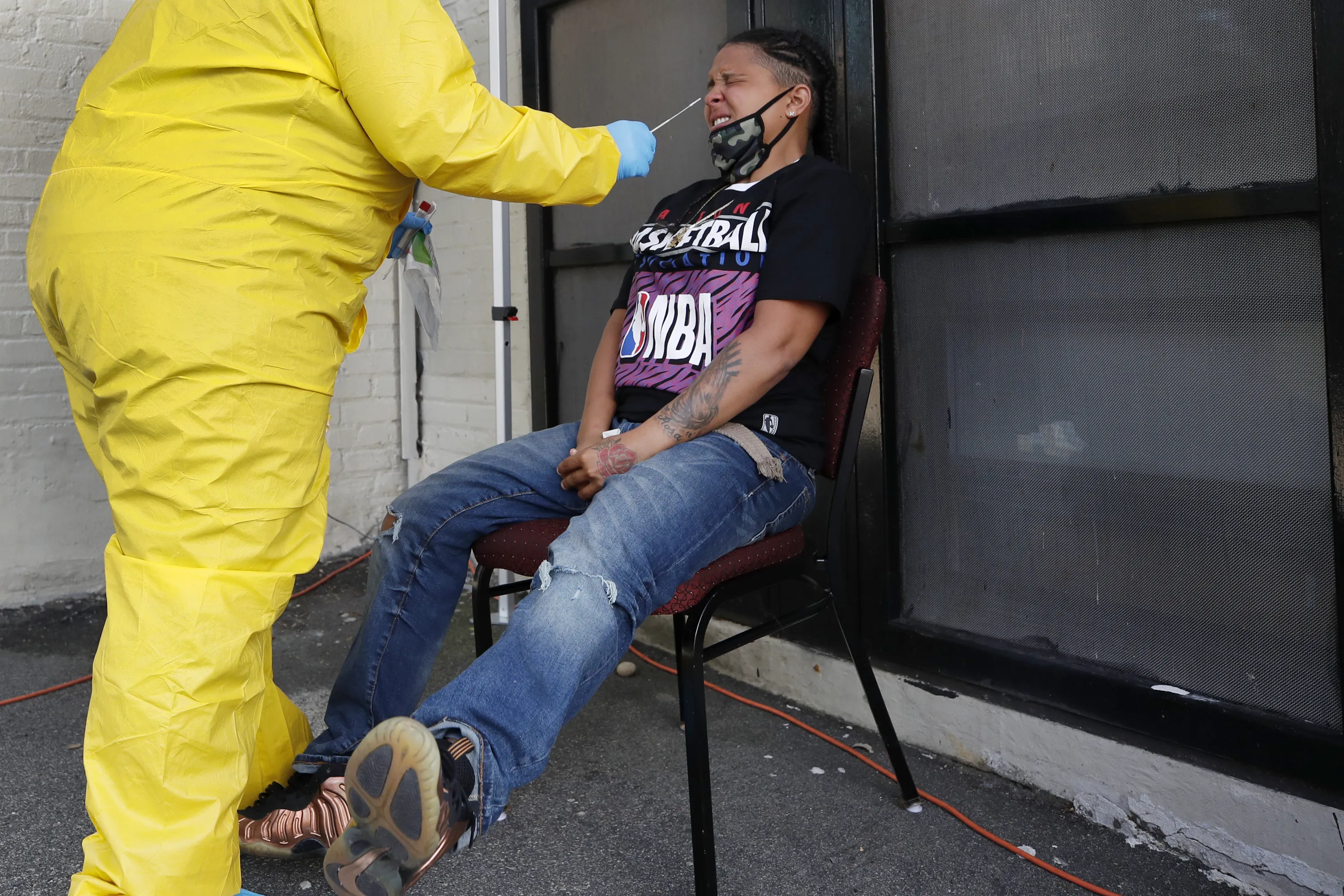 Naliber Tavares winces as she receives a COVID-19 test at the Whittier Street Health Center's mobile test site, Wednesday, July 15, 2020, in Boston's Dorchester section. The health center has administered free COVID-19 tests to over 5,000 people. The tests, administered since April 13, have been a popular service in Boston's low-income communities that have experienced high rates of infection. (Photo by Elise Amendola/AP Photo)