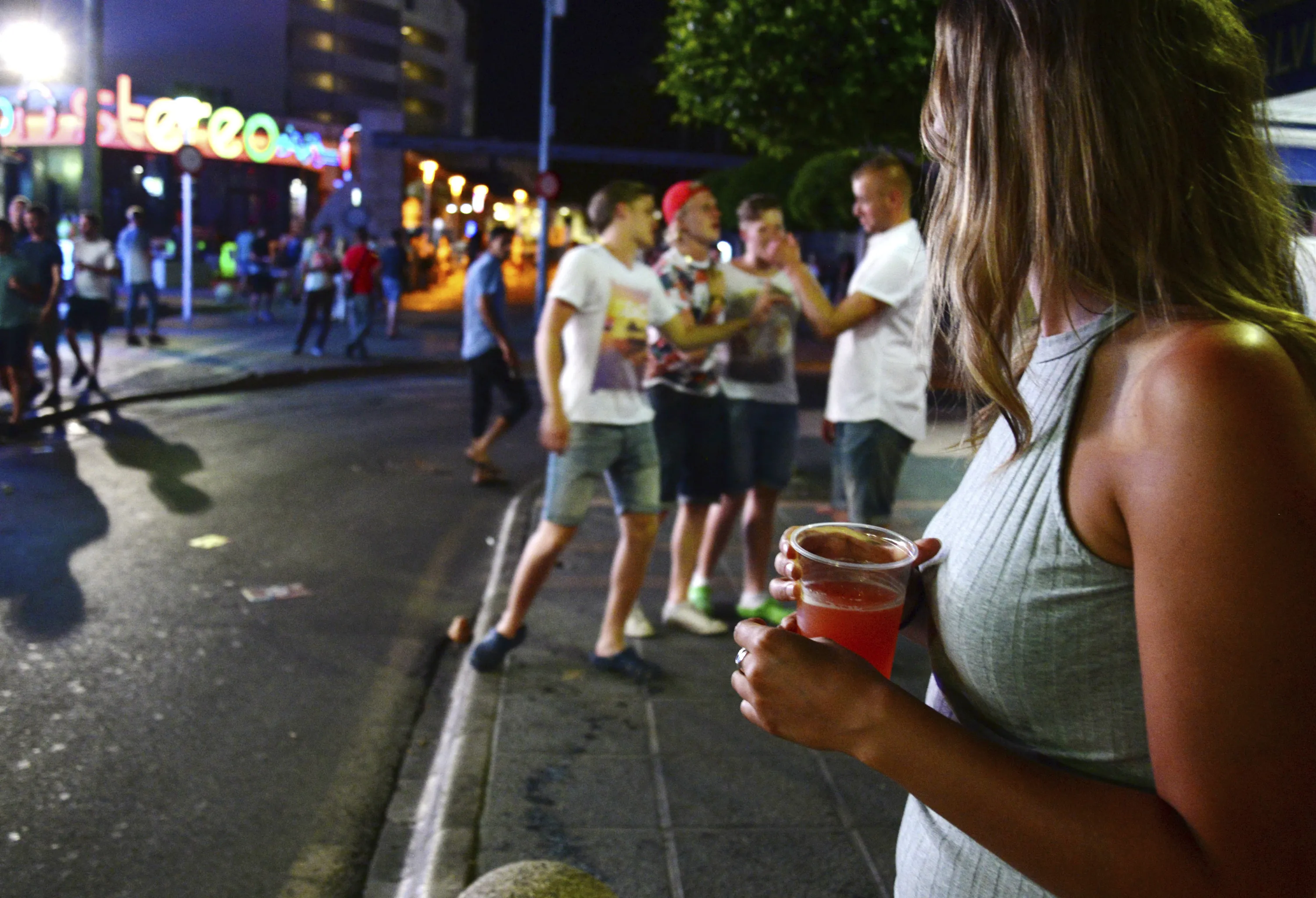 In this June 10, 2015, file photo, tourists stand on the street in Magaluf, Calvia, on the Spanish Balearic island of Mallorca, Spain. Authorities in Spain's Balearic Islands have ordered on Wednesday, July 15, 2020, the closure of bars and nightclubs in beachfront areas popular with young and foreign visitors in hopes of curbing the spread of the coronavirus and losing a reputation as a place for hard partying. (Photo by Joan Llado/AP Photo/File)