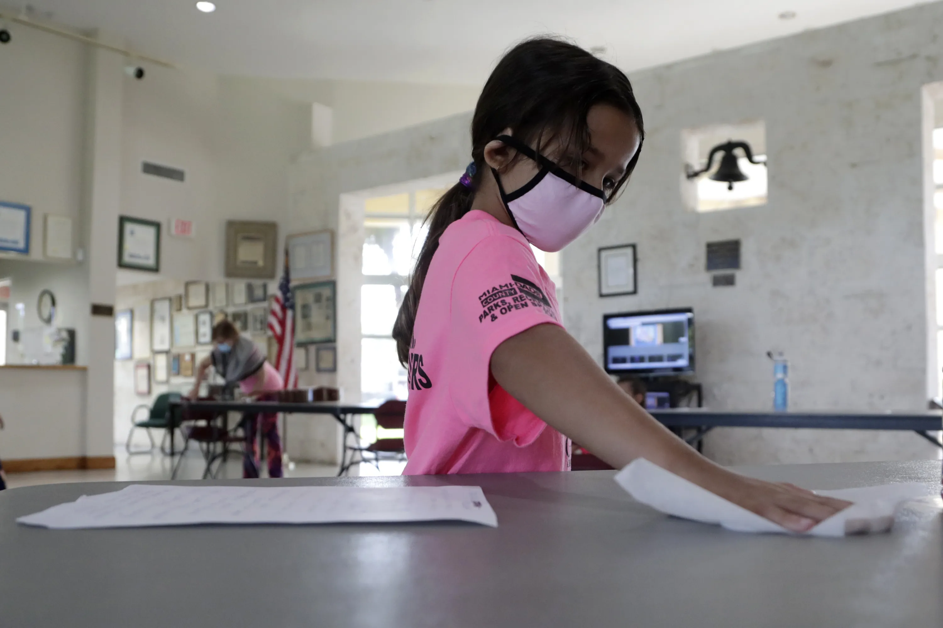 Valentina Fasano cleans her work space with sanitizing wipes at the Girl's Empowerment and Mentoring (G.E.M.) Summer Arts Camp during the coronavirus pandemic, Wednesday, July 15, 2020, in Miami. This Miami-Dade County summer camp program is operating at limited capacity, and has enhanced health screening and sanitizing procedures, practices social distancing, and required wearing of face coverings. (Photo by Lynne Sladky/AP Photo)