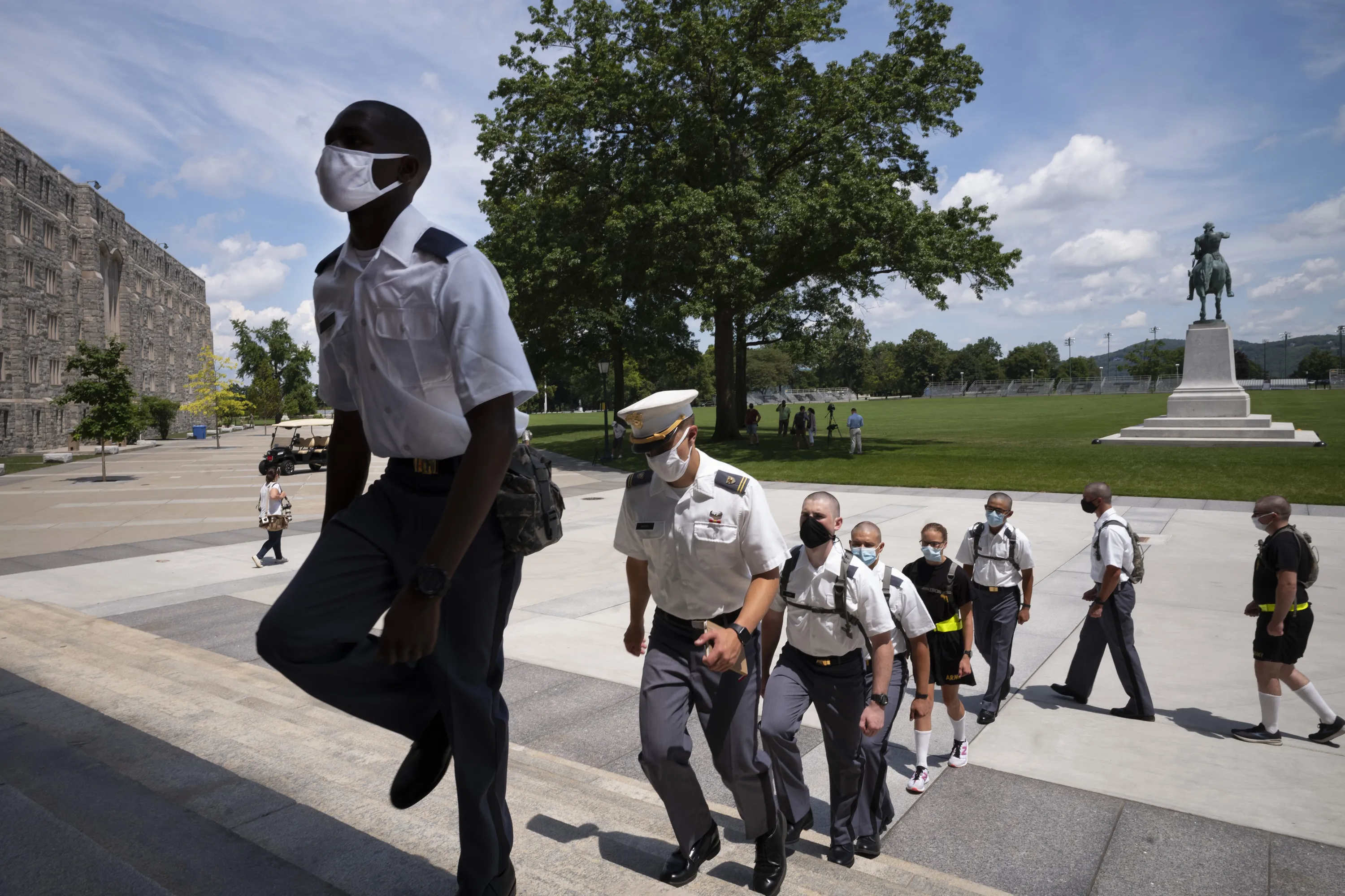 A formation of new cadets marches in formation, Monday, July 13, 2020, at the U.S. Military Academy in West Point, N.Y. The Army is welcoming more than 1,200 candidates from every state. Candidates will be COVID-19 tested immediately upon arrival, wear masks, and practice social distancing. (Photo by Mark Lennihan/AP Photo)