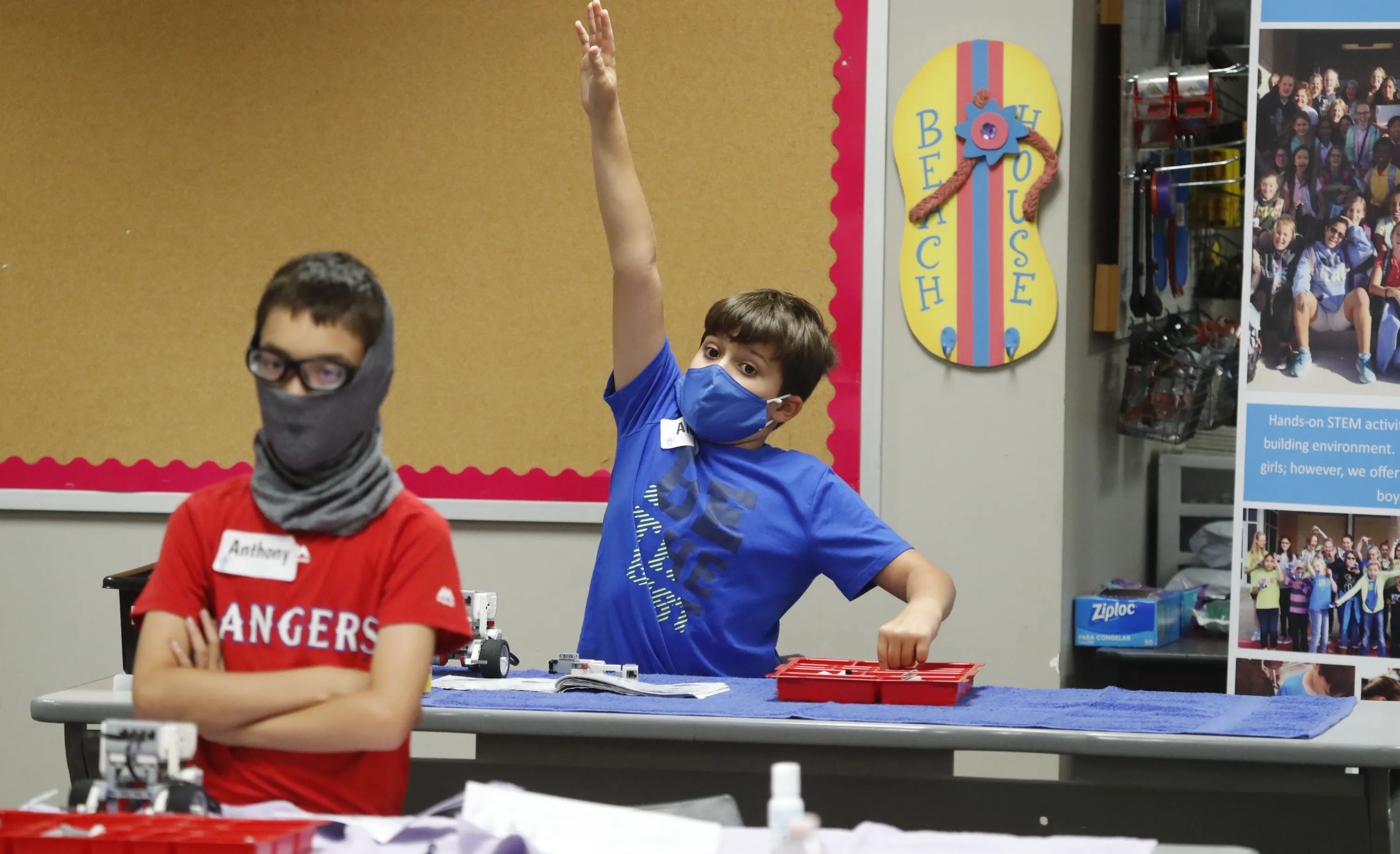 Amid concerns of the spread of COVID-19, Aiden Trabucco, right, wears a mask as he raises his hand to answer a question behind Anthony Gonzales during a summer STEM camp at Wylie High School Tuesday, July 14, 2020, in Wylie, Texas. (Photo by L.M. Otero/AP Photo)