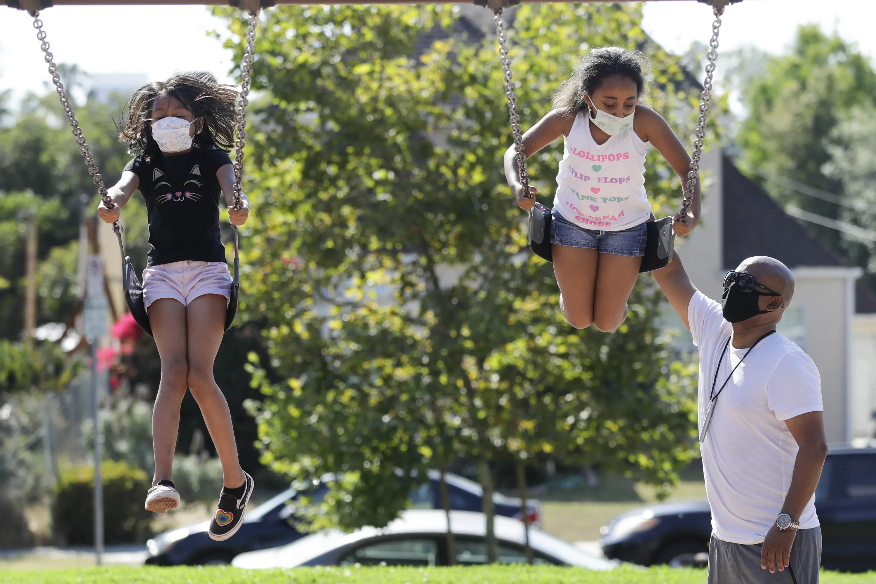 Afework Meshesha, right, pushes his daughter Yohanna while she rides a swing at a playground, Saturday, July 11, 2020, in Los Angeles. The number of deaths per day from the coronavirus in the U.S. had been falling for months, and even remained down as some states saw explosions in cases. But now a long-expected upturn has begun, driven by fatalities in states in the South and West. (Photo by Marcio Jose Sanchez/AP Photo)