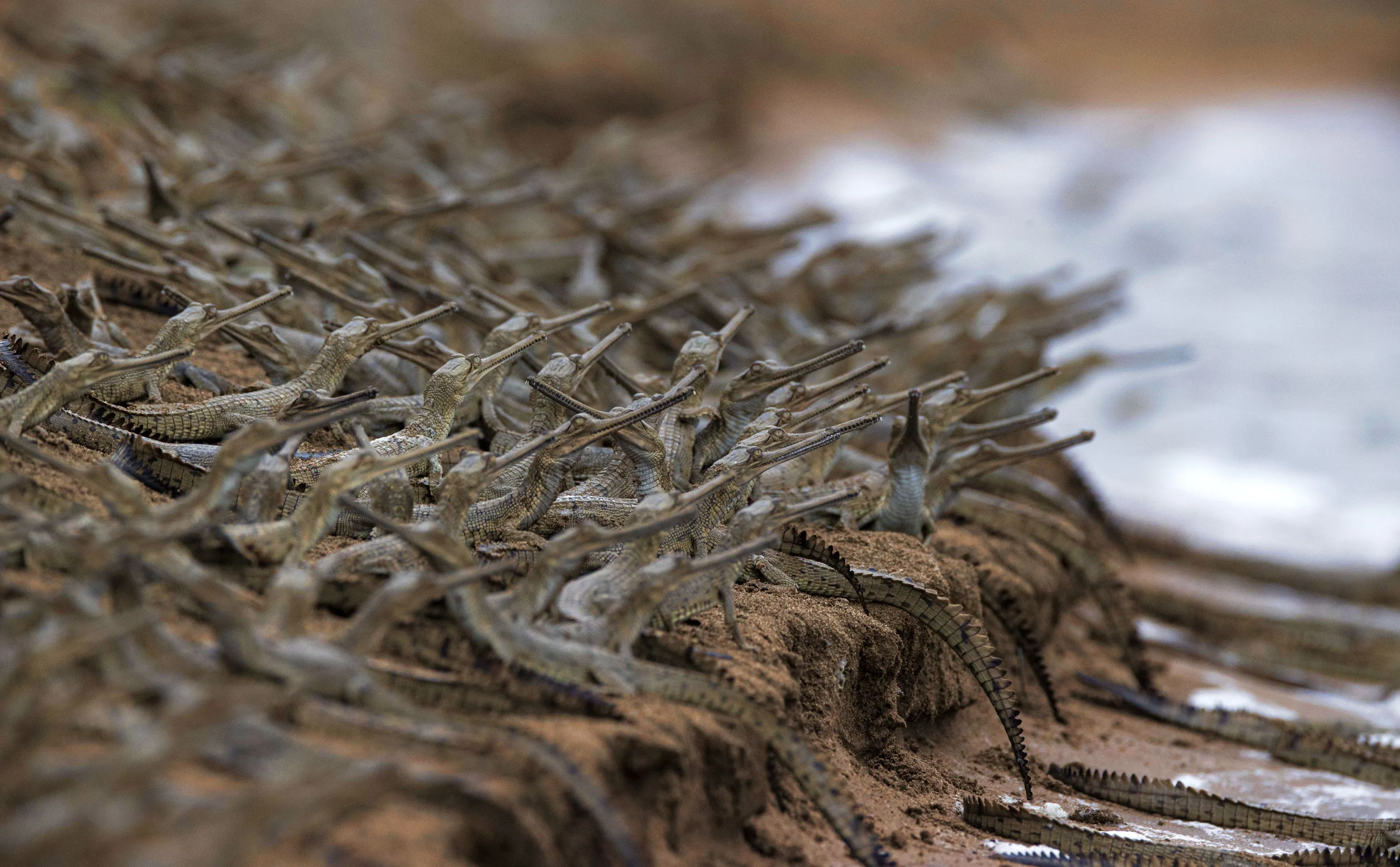 A sea of young crocodiles look like a tiny army as they congregate on a shoreline on July 2020. The 20 day old gharials, unique to South Asia, make the banking look black. Wildlife photographer Shivang Mehta pictured the critically endangered species on the banks of the Chambal river in Rajasthan, India. (Photo by Shivang Mehta/Solent News & Photo Agency)