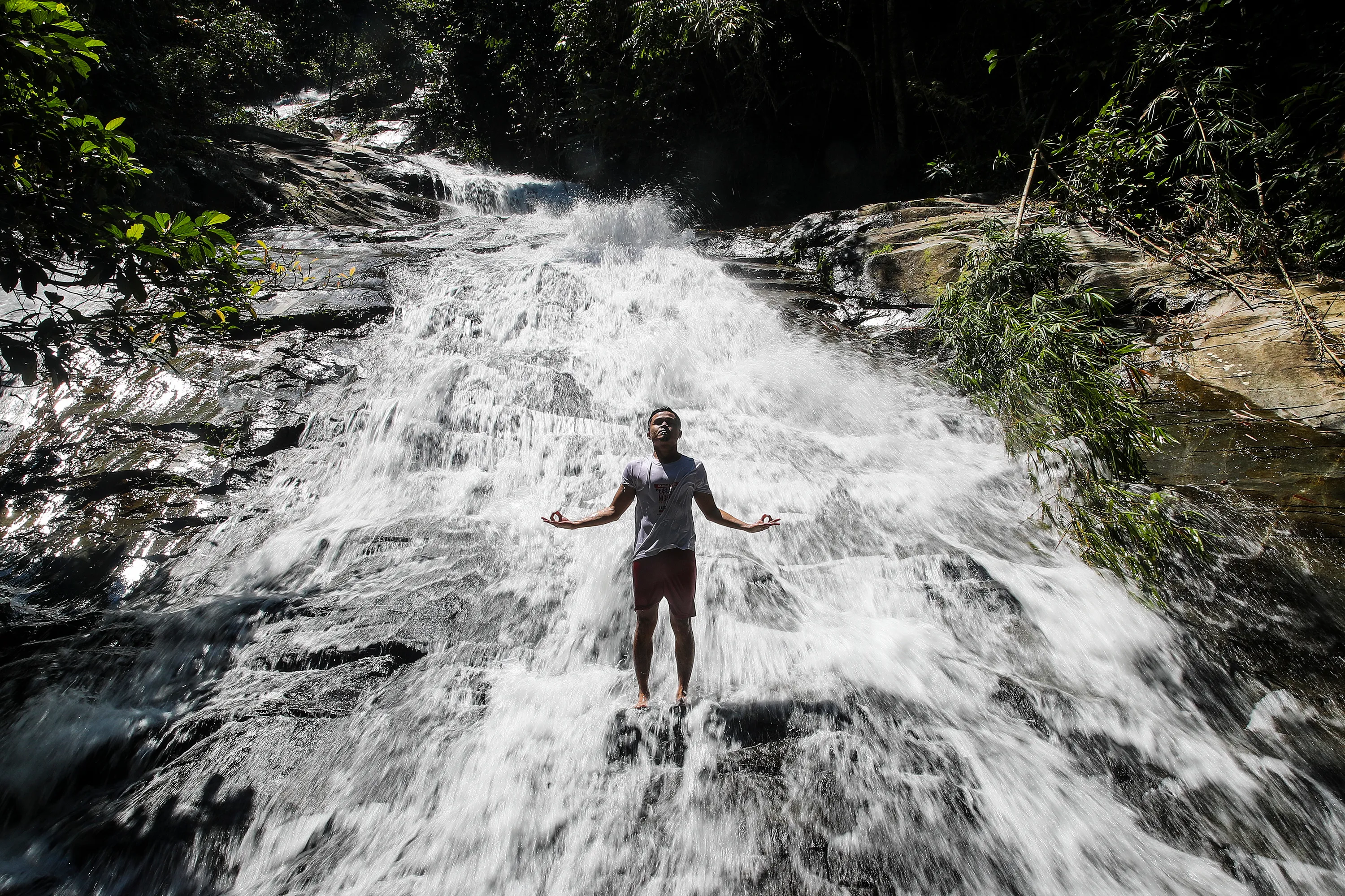 A man reacts as his partner (not seen) takes his picture at the waterfall in Hulu Langat river, outside Kuala Lumpur, Malaysia, 01 July 2020. “Recreational activities at swimming pools, rivers, lakes and in the sea will be allowed from 01 July”, according to Senior Minister for Security Ismail Sabri Yaakob on 22 June. (Photo by Fazry Ismail/EPA/EFE)