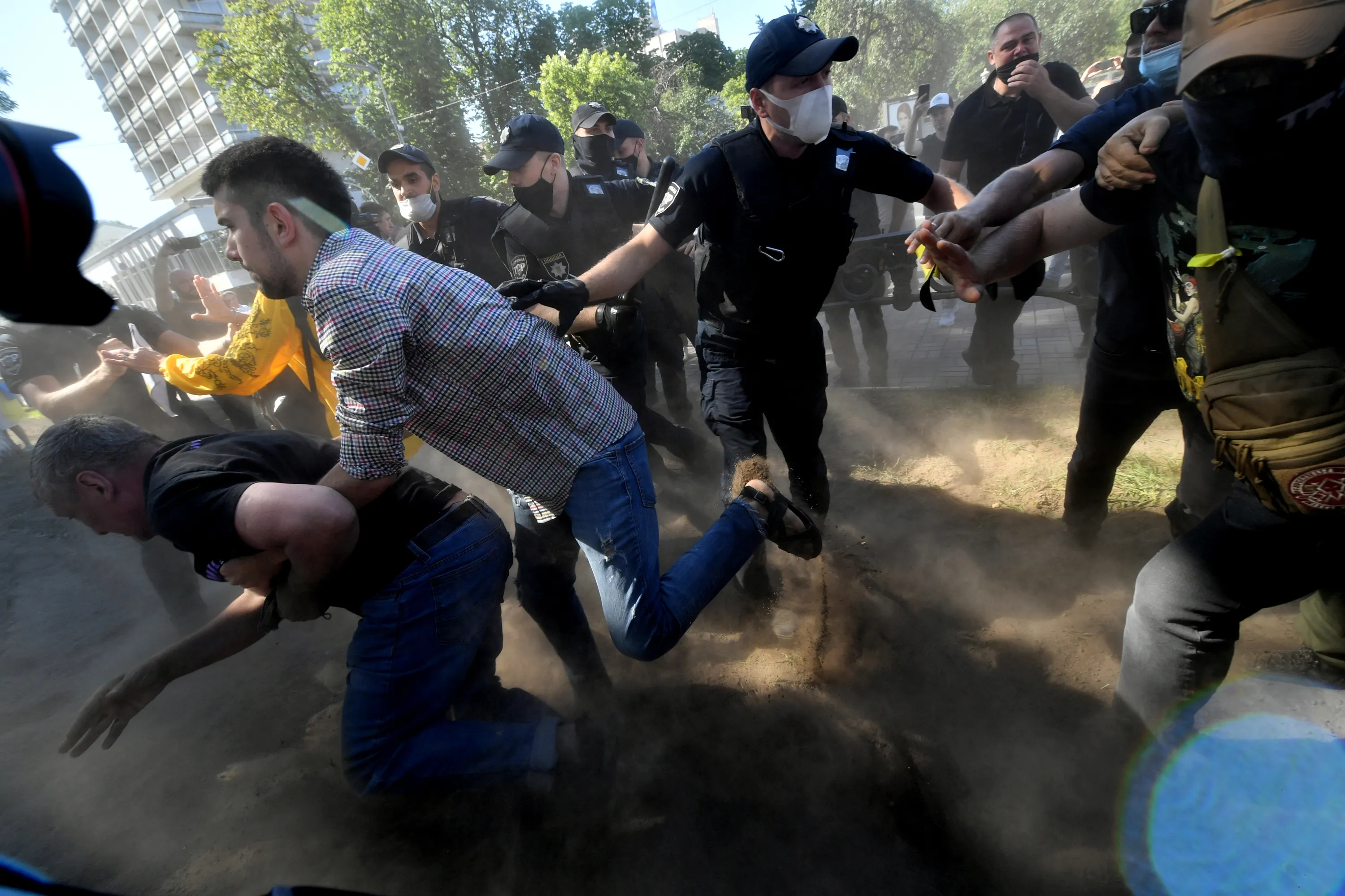Opposition supporters clash with policemen during a rally against a bill to limit Ukrainian language in schools outside the parliament in Kiev on July 17, 2020. A deputy in the party of President Volodymyr Zelensky has proposed legislation that would reduce the use of Ukrainian language in schools. A large proportion of the population speaks Russian, which was the dominant language in the Soviet Union and the Tsarist era. Critics of the bill say it paves the way for the “total Russification of education”. (Photo by Sergei Supinsky/AFP Photo)