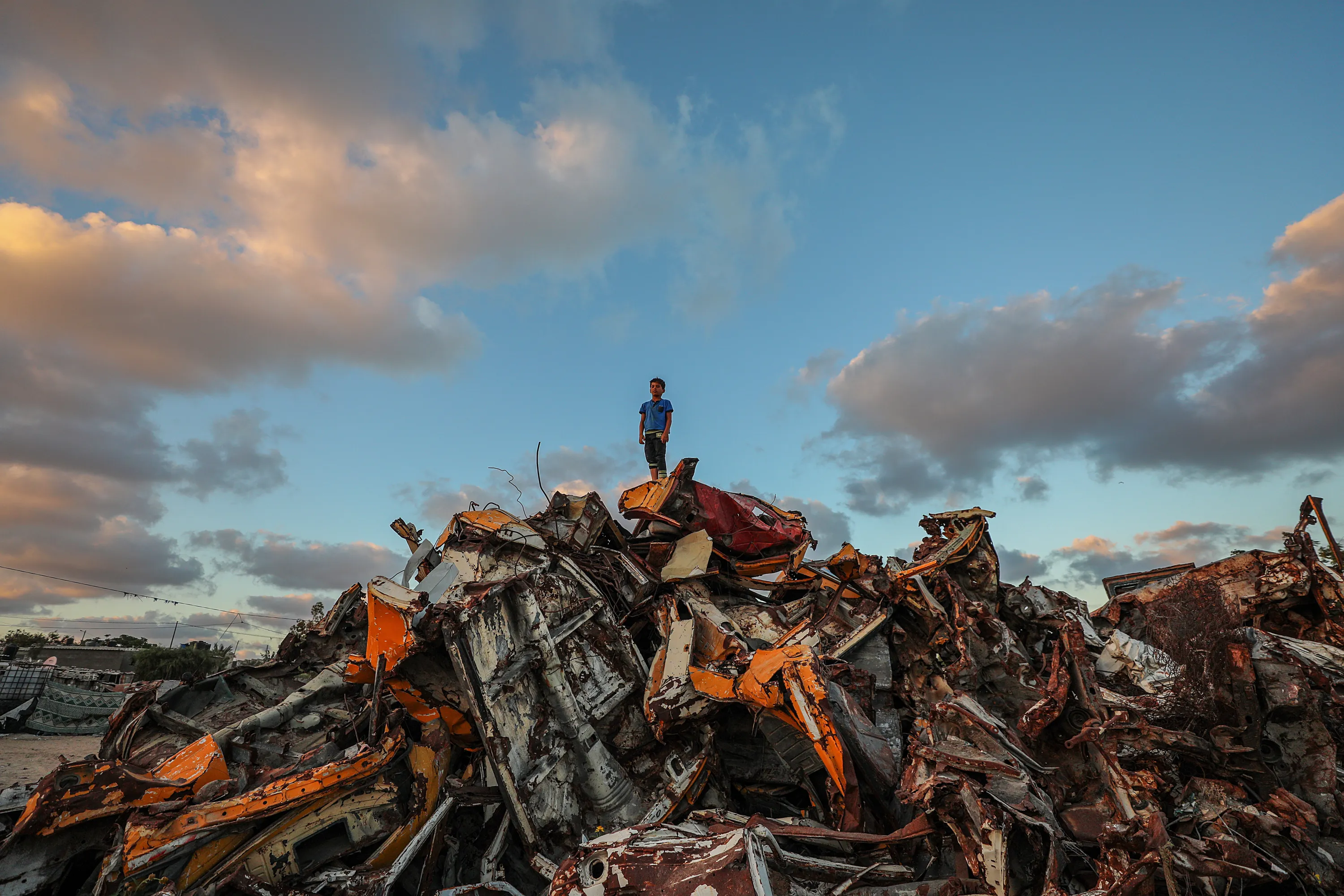 A Palestinian refugee boy stands at the destroyed cars near his family house in Khan Younis refugee camp in the southern Gaza Strip, 24 June 2020. (Photo by Mohammed Saber/EPA/EFE)