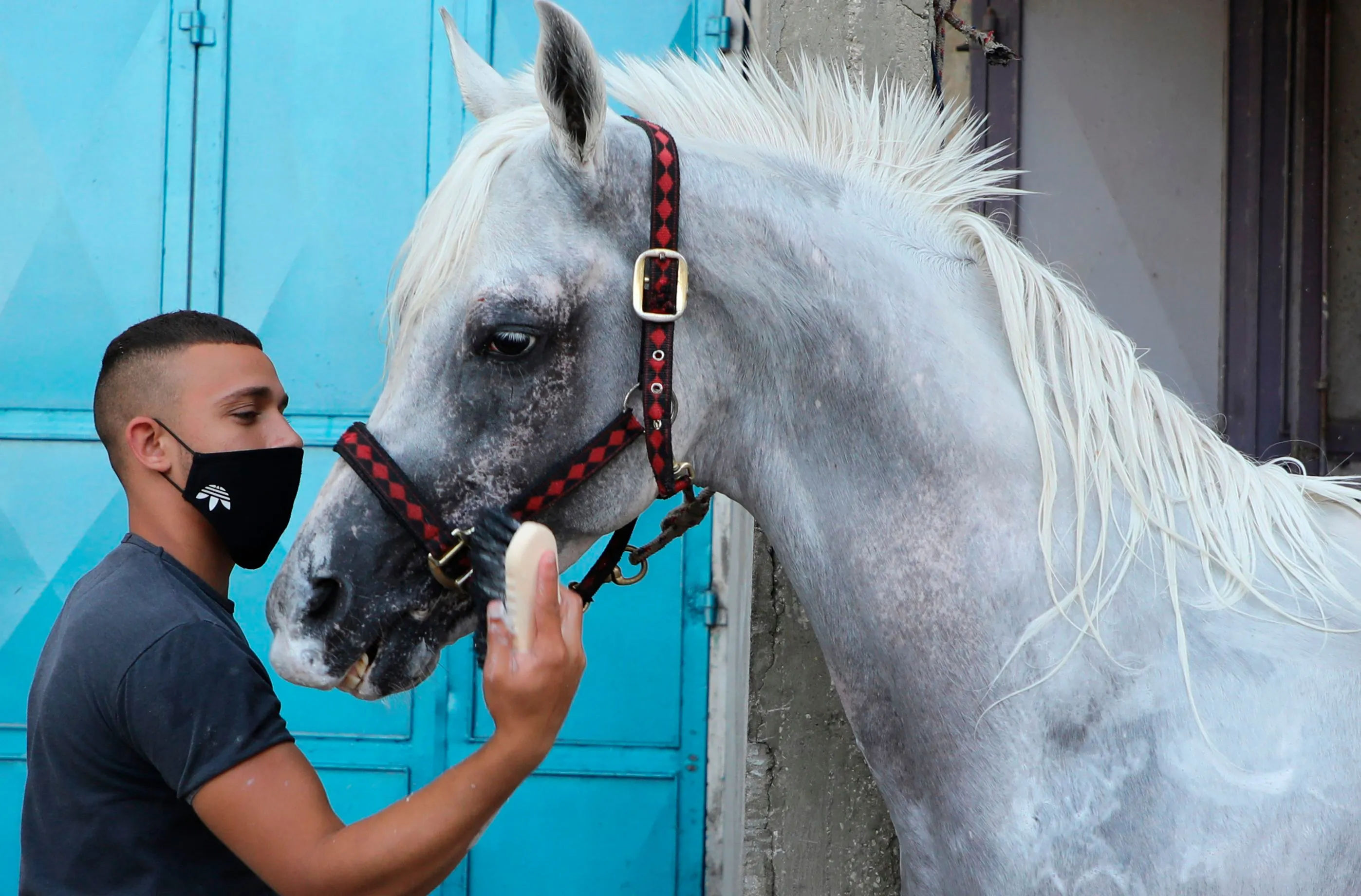 A mask-clad resident of the Askar Palestinian refugee camp, east of the West Bank city of Nablus, is pictured with a horse, during the novel coronavirus pandemic crisis, on July 13, 2020. The Palestinian Authority yesterday imposed a night-time and weekend curfew on the occupied West Bank for the coming 14 days to try and rein in rising coronavirus numbers. (Photo by Jaafar Ashtiyeh/AFP Photo)