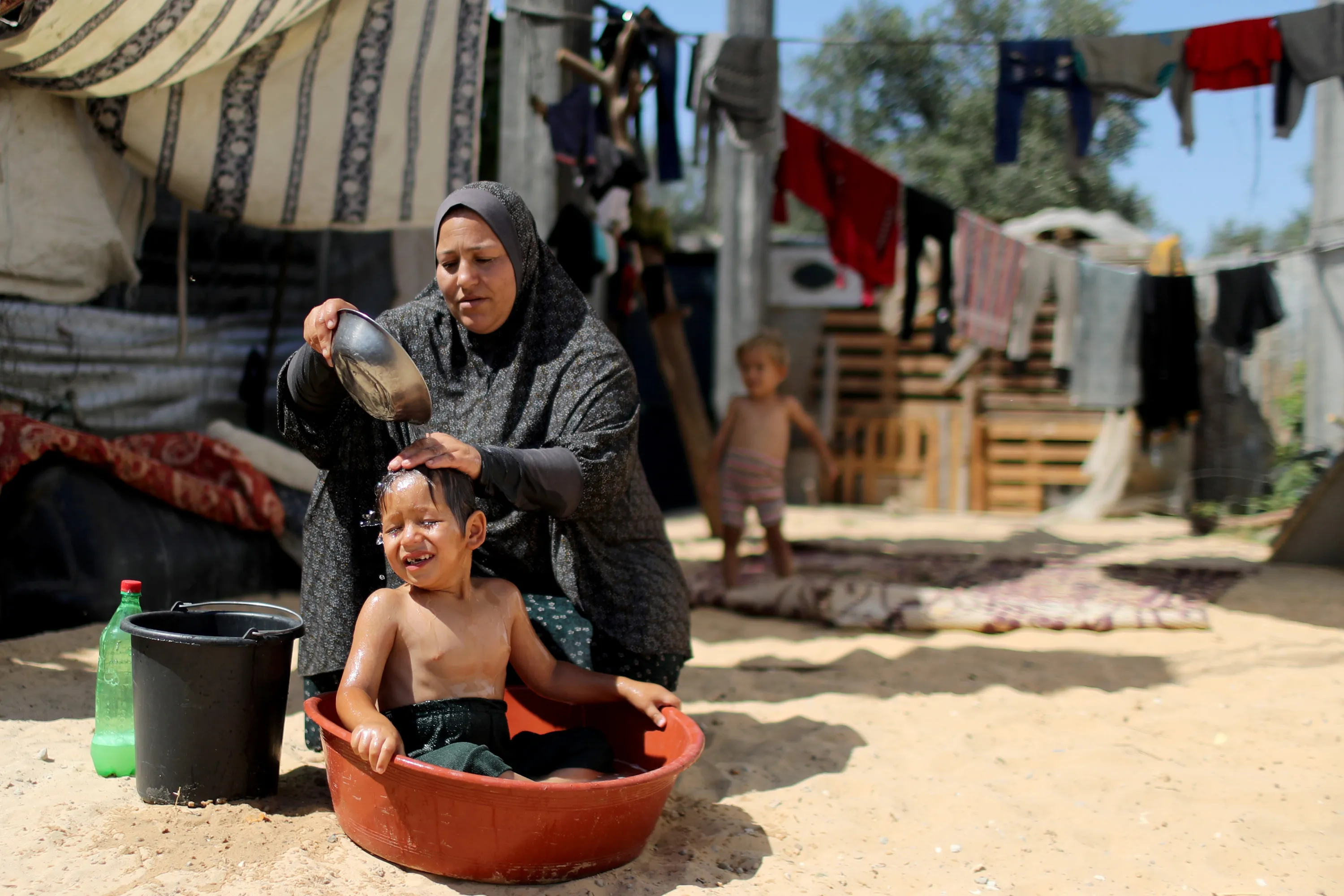 A Palestinian woman bathes her son in a plastic basin on a hot day outside their dwelling in the northern Gaza Strip on July 15, 2020. (Photo by Mohammed Salem/Reuters)