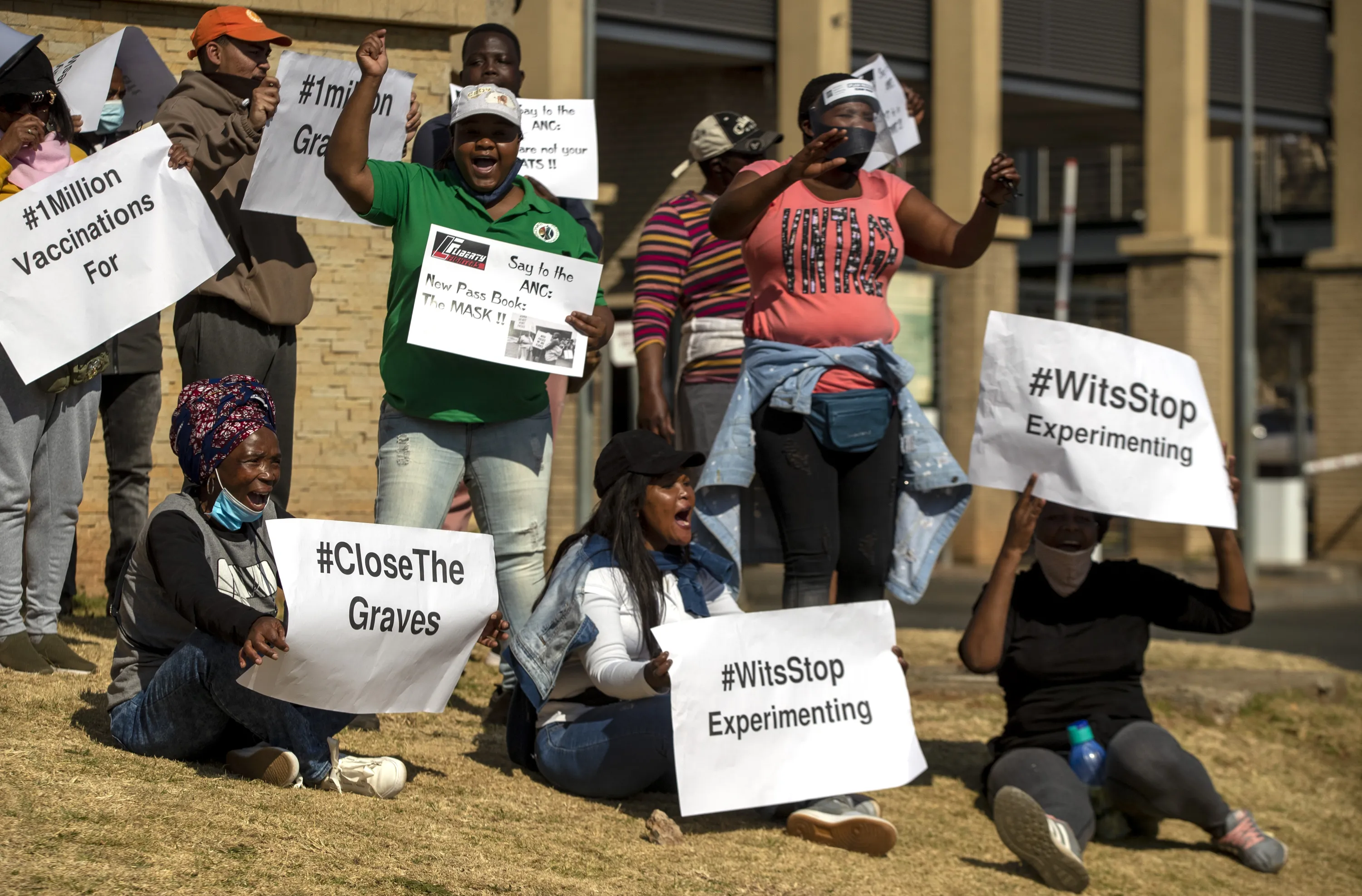 People protest against coronavirus trials in Africa, outside Chris Hani Baragwanath Hospita in the township of Soweto in Johannesburg, South Africa, Saturday, July 18, 2020, The first clinical trial in Africa for a COVID-19 vaccine started last week in South Africa. Experts note a worrying level of resistance and misinformation around testing on the continent. (Photo by Themba Hadebe/AP Photo)