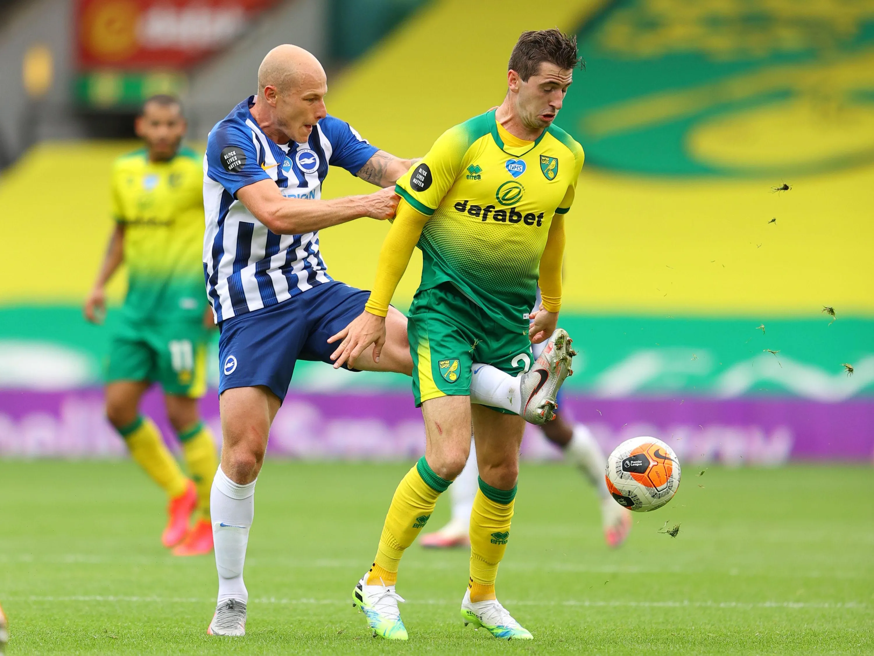 Brighton & Hove Albion's Aaron Mooy in action with Norwich City's Kenny McLean in Norwich, Britain on July 4, 2020. (Photo by Richard Heathcote/Reuters)