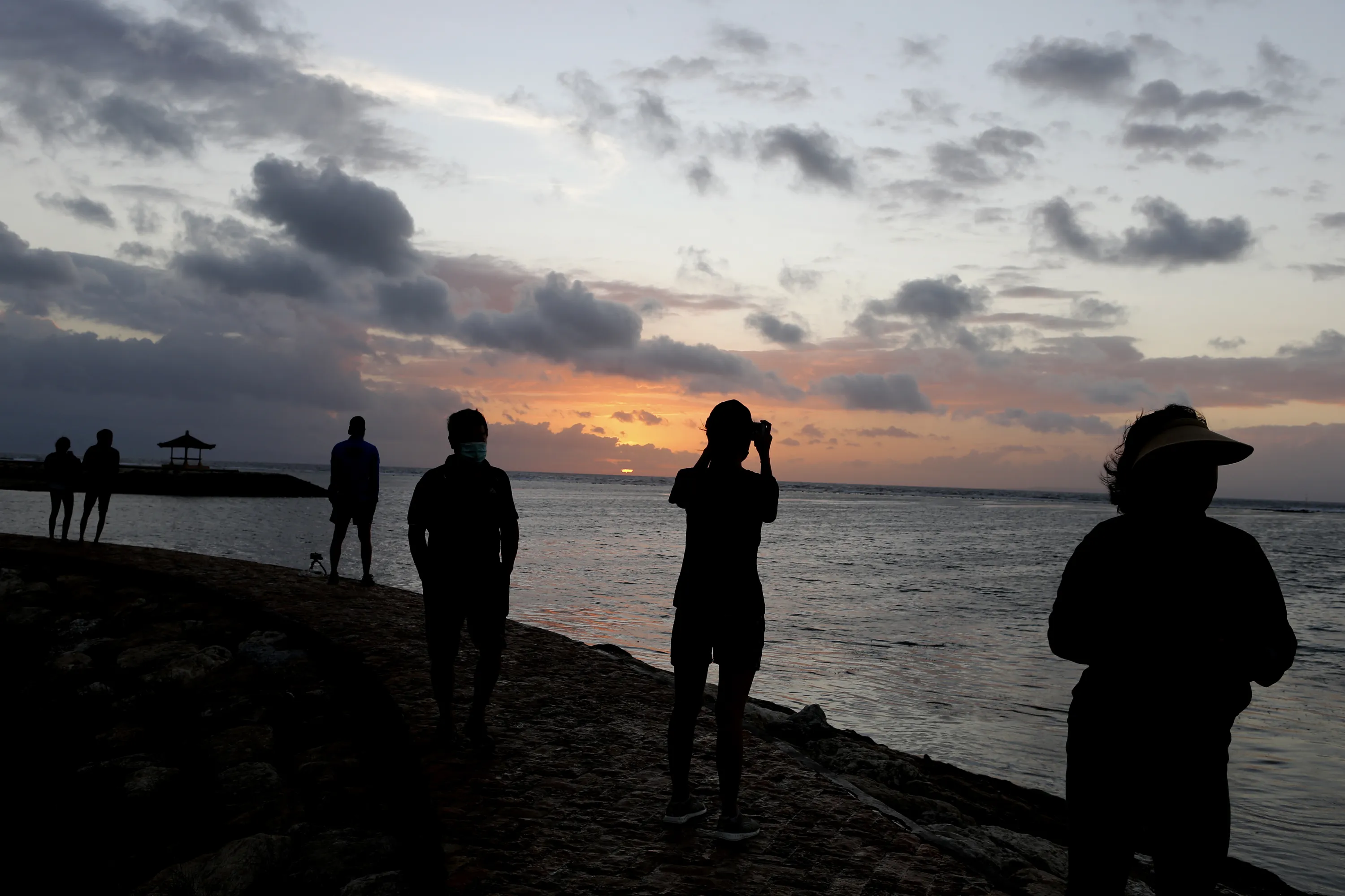 People watch the sunrise at a beach in Bali, Indonesia on Thursday, July 9, 2020. Indonesia's resort island of Bali reopened after a three-month virus lockdown Thursday, allowing local people and stranded foreign tourists to resume public activities before foreign arrivals resume in September. (Photo by Firdia Lisnawati/AP Photo)