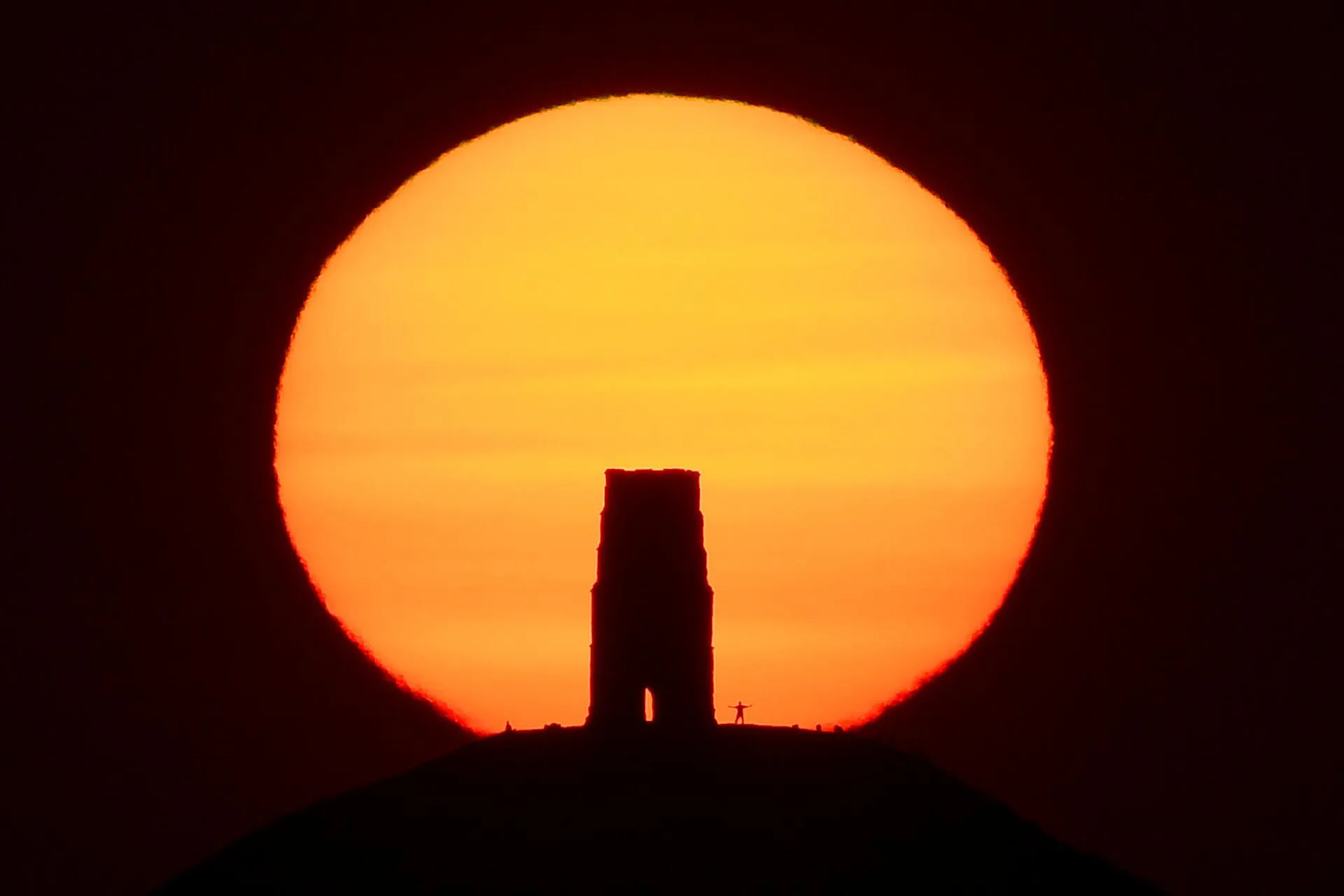 A person views the sun rise from beside the remains of Saint Michael's Church on top of Glastonbury Tor, as the hottest day so far of the summer in Britain is predicted, in Glastonbury, south west Britain on June 24, 2020. (Photo by Toby Melville/Reuters)