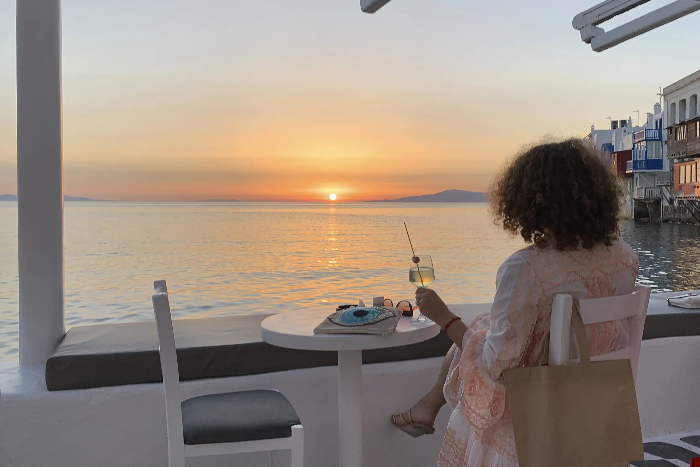 In this Tuesday, June 9, 2020 photo, a visitor watches the sunset at a bar in an area known as Little Venice in the main town of the island of Mykonos, Greece. Business owners and locals officials on the Greek holiday island of Mykonos, a popular vacation spot for celebrities, club-goers, and high rollers, say they are keen to reopen for business despite the risks of COVID-19 posed by international travel. Greece will official launch its tourism season Monday, June 15, 2020 after keeping the country's infection rate low. (Photo by Derek Gatopoulos/AP Photo)