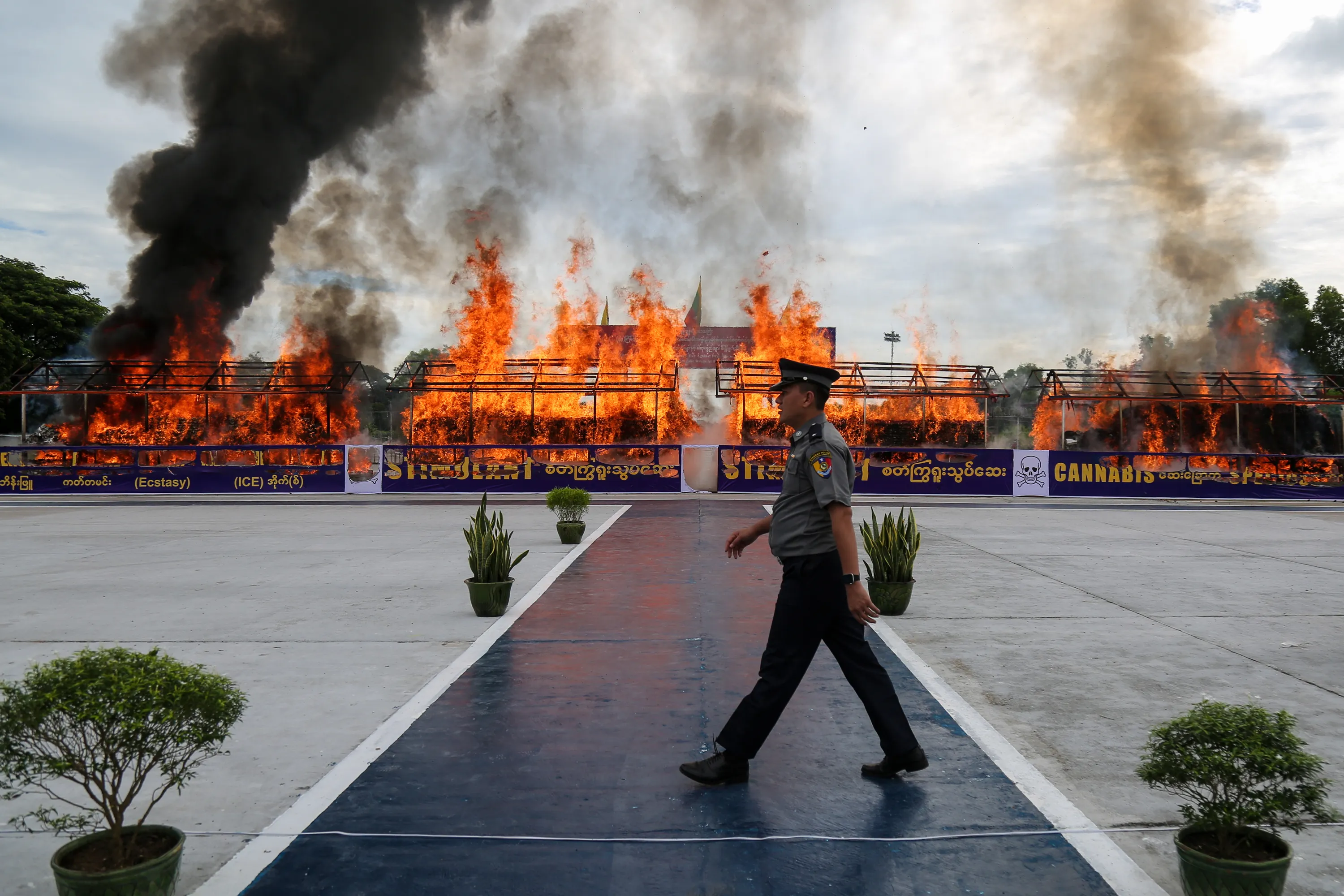 A police officer walks in front of a burning pile of seized illegal drugs during a destruction ceremony to mark the United Nations' “International Day against Drug Abuse and Illicit Trafficking” in Yangon on June 26, 2020. (Photo by Sai Aung Main/AFP Photo)