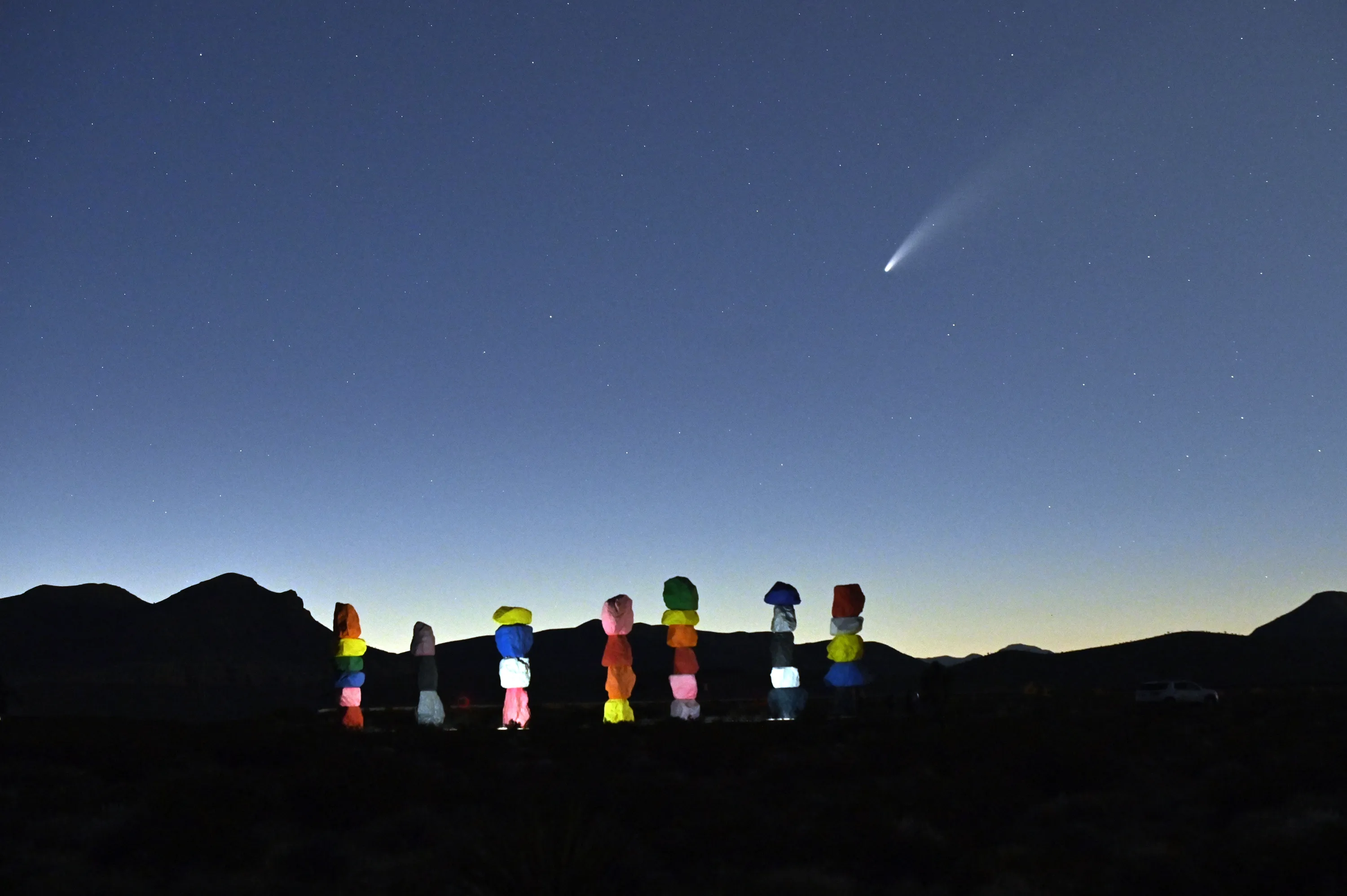Comet NEOWISE or C/2020 F3 is seen in the sky, above the “Seven Magic Mountains” art installation by artist Ugo Rondinone, in Jean, Nevada on July 15, 2020. The comet was discovered March 27, 2020, by NEOWISE, the Near Earth Object Wide-field Infrared Survey Explorer, which is a space telescope launched by NASA in 2009. The “Seven Magic Mountains” public art installation by artist Ugo Rondinone is located in the desert south of Las Vegas and is made up of seven pillars of colored boulders stacked more than 30 feet high. (Photo by David Becker/AFP Photo)