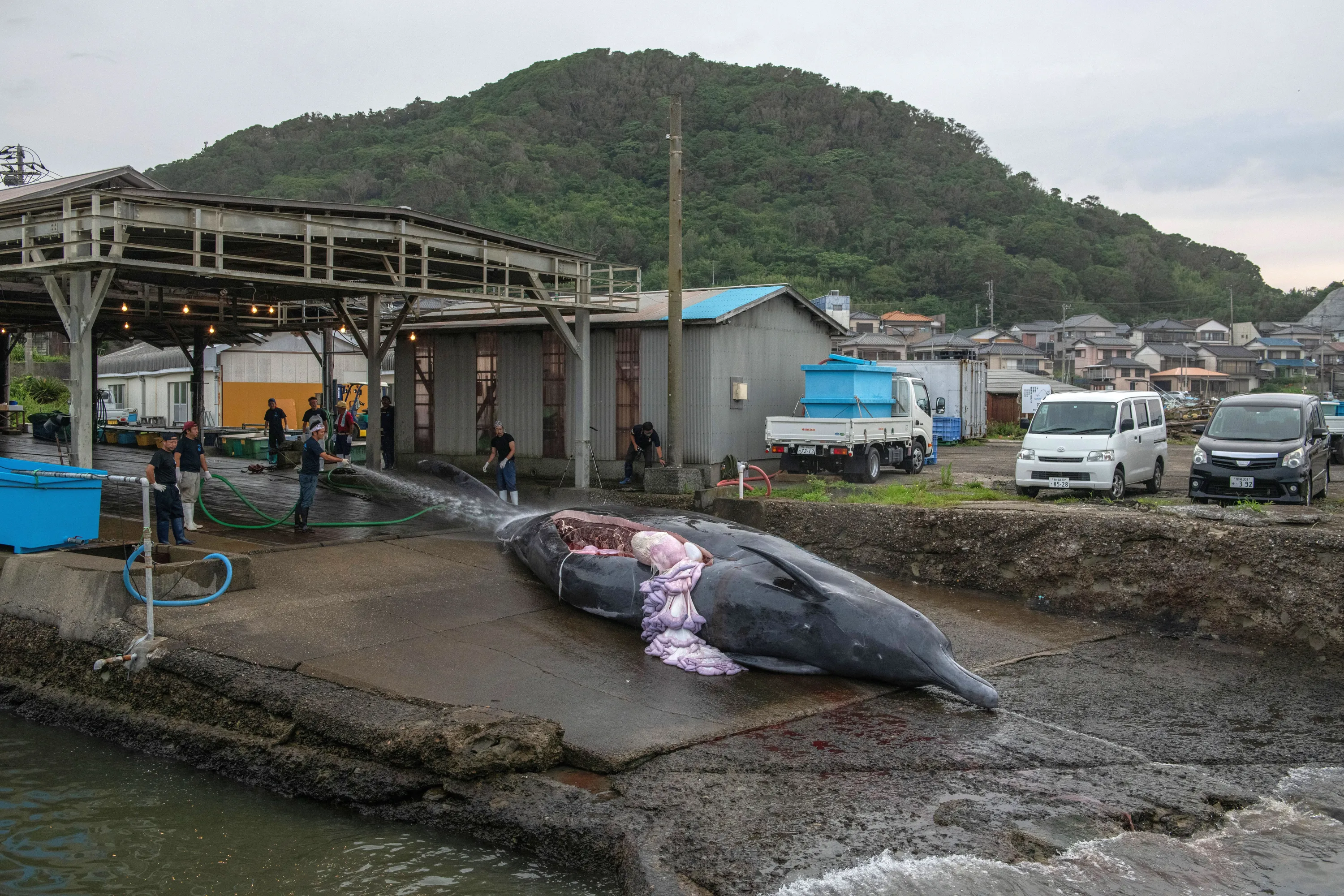 A 10.5 metre Baird's Beaked Whale is winched into a slaughterhouse on July 21, 2020 in Wada Port, Chiba, Japan. Despite criticism following Japans withdrawal from the International Whaling Commission (IWC) last year, the country has resumed limited commercial whale fishing after an effective ban of over 30 years. Japan has long claimed that whale hunting is a part of its culture, with some coastal communities having hunted the mammals for over 400 years and the meat considered a national delicacy. (Photo by Carl Court/Getty Images)