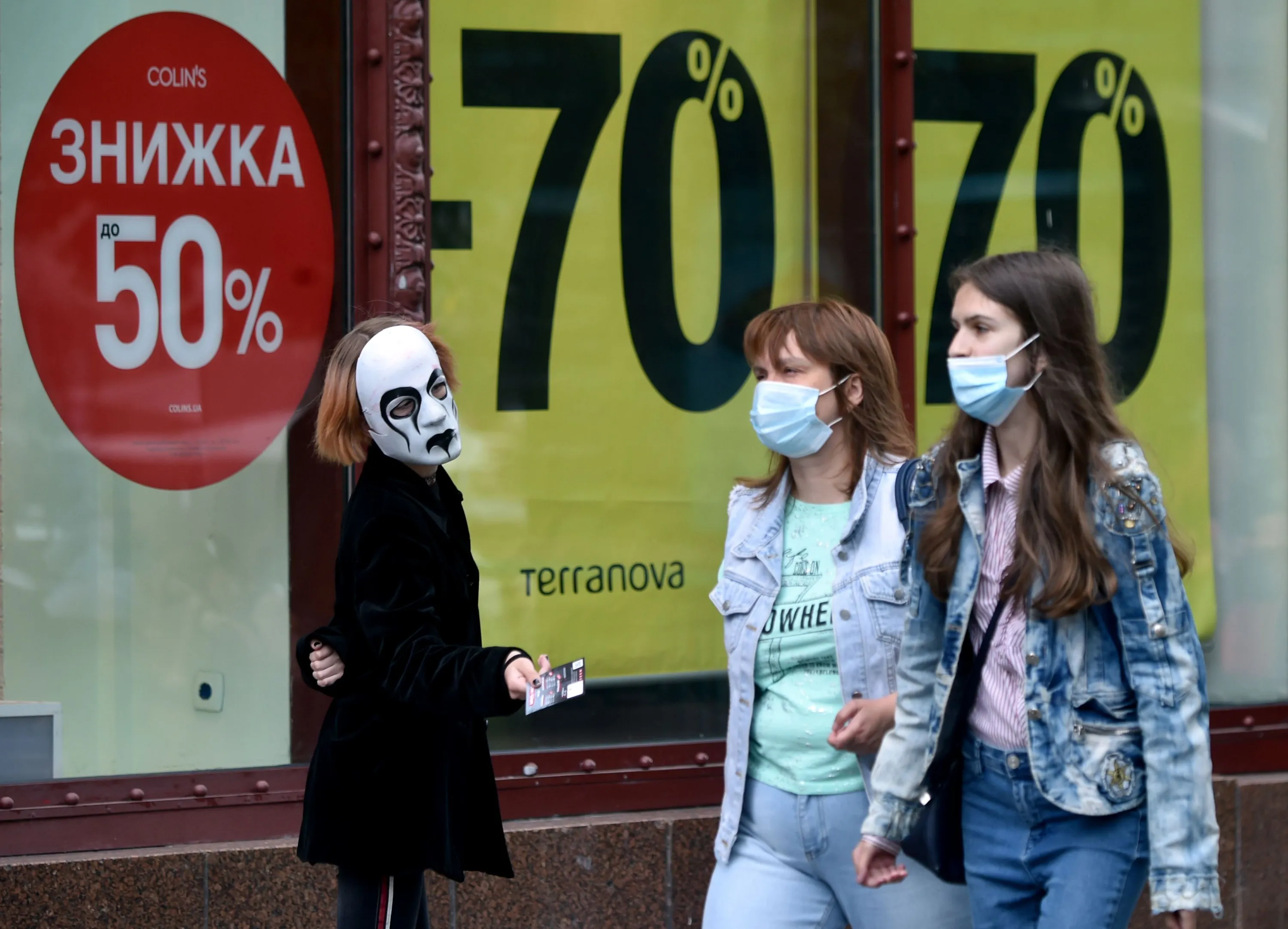A clothing store promoter wearing a theatrical mask gives out advertising leaflets to passers-by wearing face masks in the center of the Ukrainian capital of Kiev on July 15, 2020. (Photo by Sergei Supinsky/AFP Photo)
