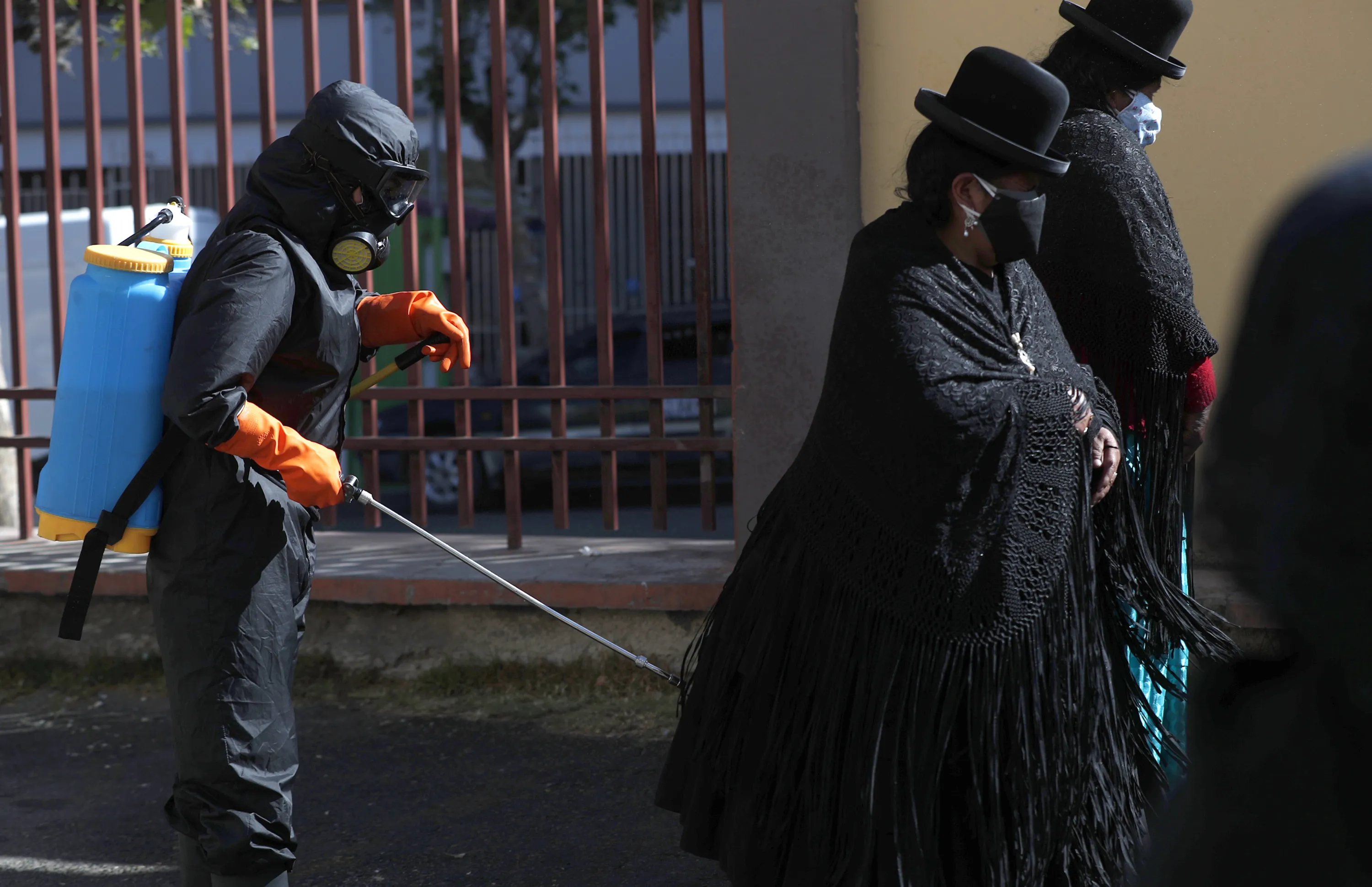 A funeral home worker wearing full protective gear as a precaution against the spread of the new coronavirus sprays disinfectant over the relatives the late Guillermo Carpio, outside the General Hospital in La Paz, Bolivia, Wednesday, July 22, 2020. Herminia Carpio said her 58-year-old brother died the previous afternoon, and according to the hospital he died from COVID-19 complications. (Photo by Juan Karita/AP Photo)