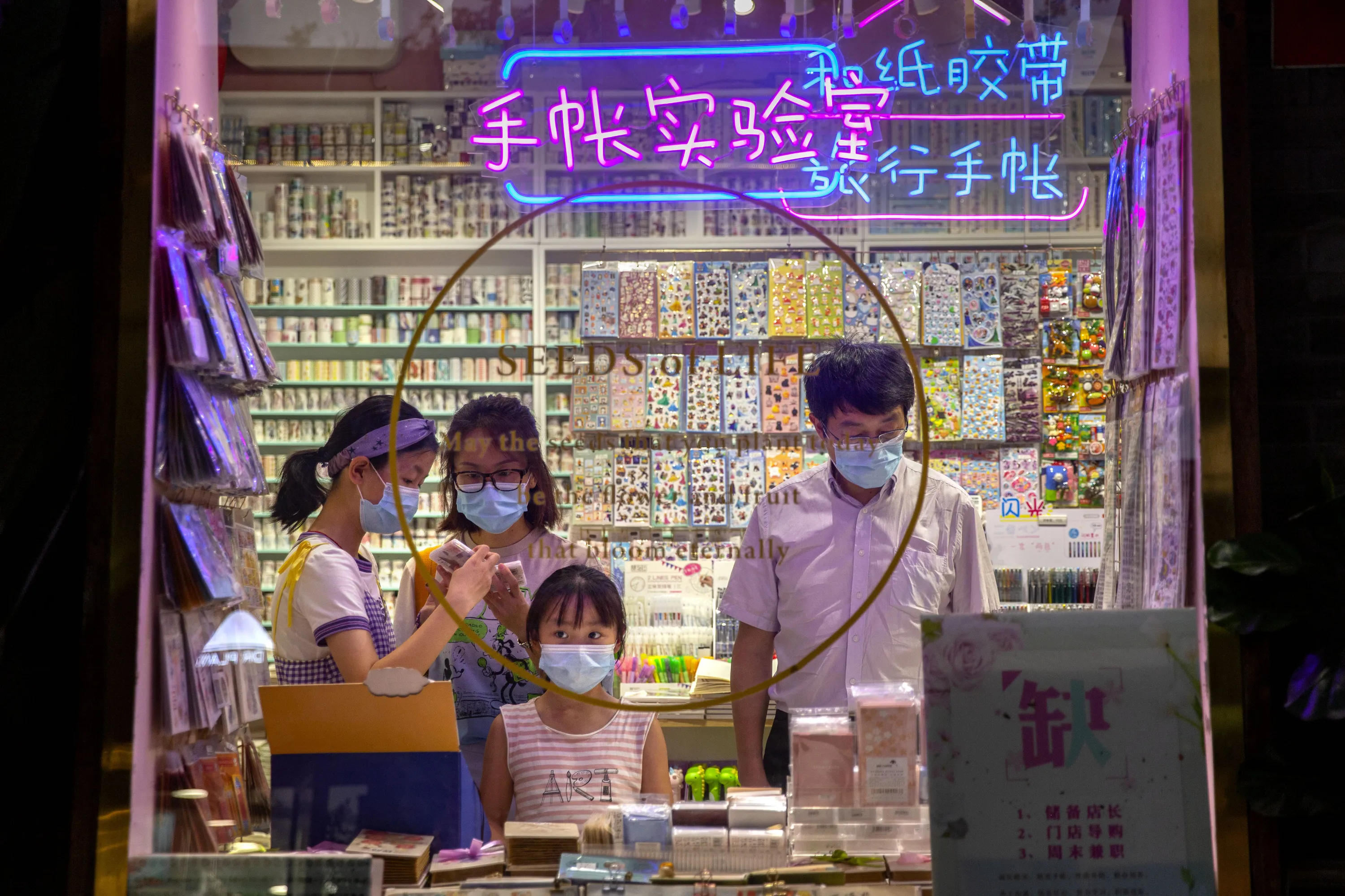 People wearing face masks to protect themselves against the coronavirus shop in a store along a pedestrian shopping street in Beijing, Wednesday, July 22, 2020. Numbers of cases in China's latest virus outbreak continued to fall Wednesday, with several new cases in the northwestern region of Xinjiang. (Photo by Mark Schiefelbein/AP Photo)