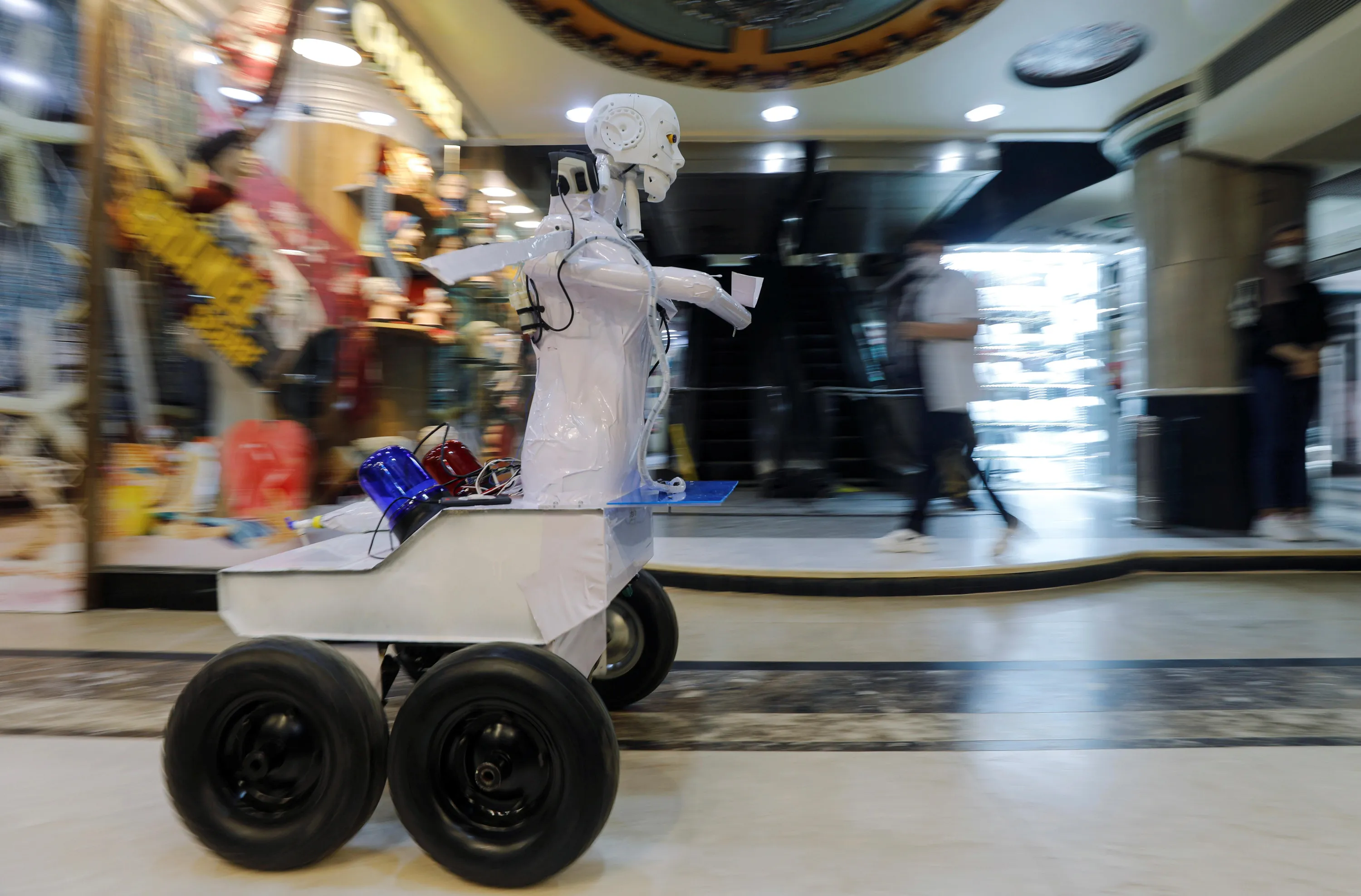 The remote-controlled robot that was built by Egyptian mechanical engineer, Mahmoud El komy, 26, moves in a mall to test people for the coronavirus by running PCR tests and limiting exposure to suspected cases in Cairo, Egypt on June 12, 2020. (Photo by Mohamed Abd El Ghany/Reuters)