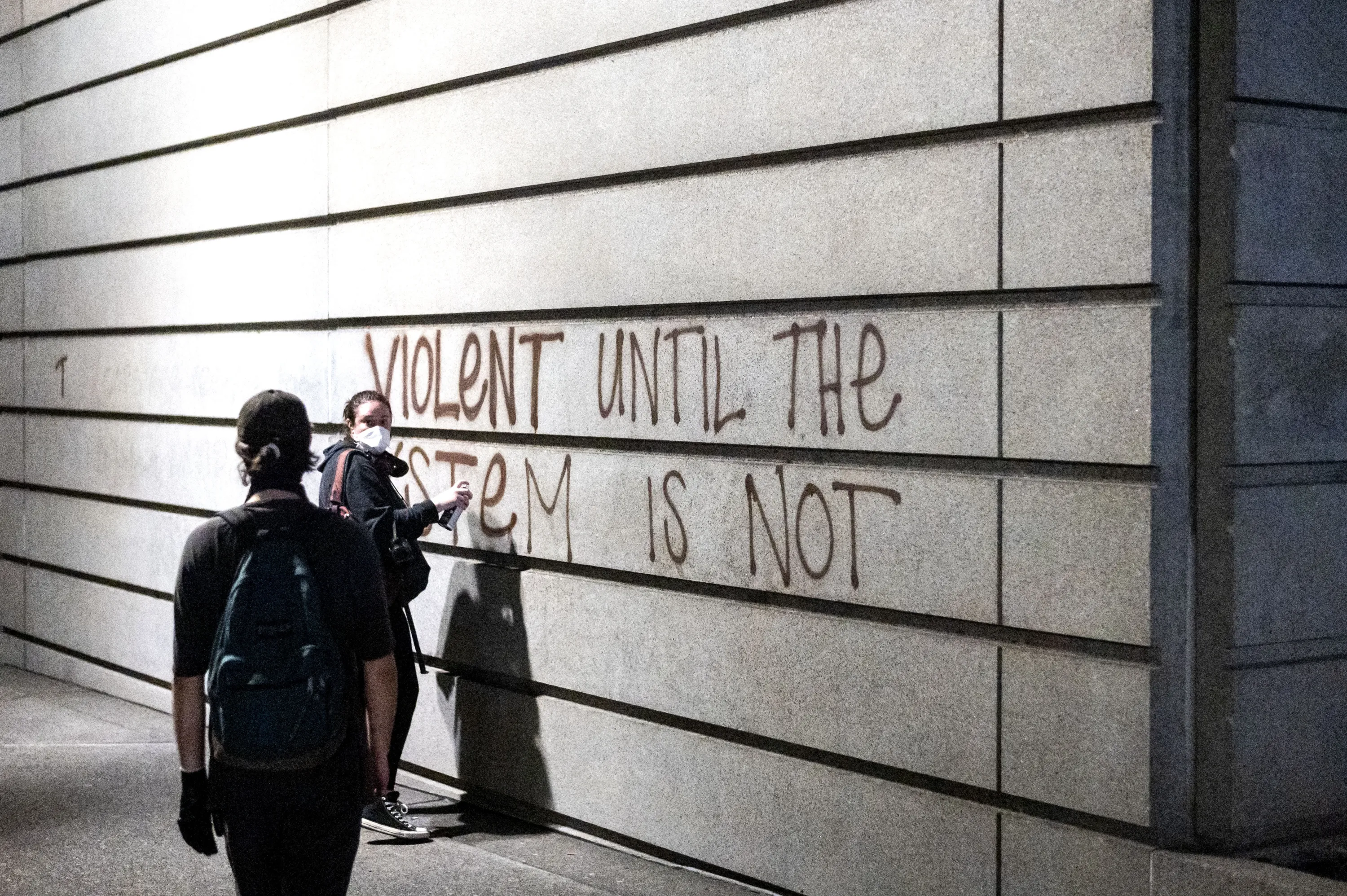 A protester spraypaints a wall during a Black Lives Matter demonstration on Monday, July 20, 2020, in Portland, Ore. (Photo by Noah Berger/AP Photo)