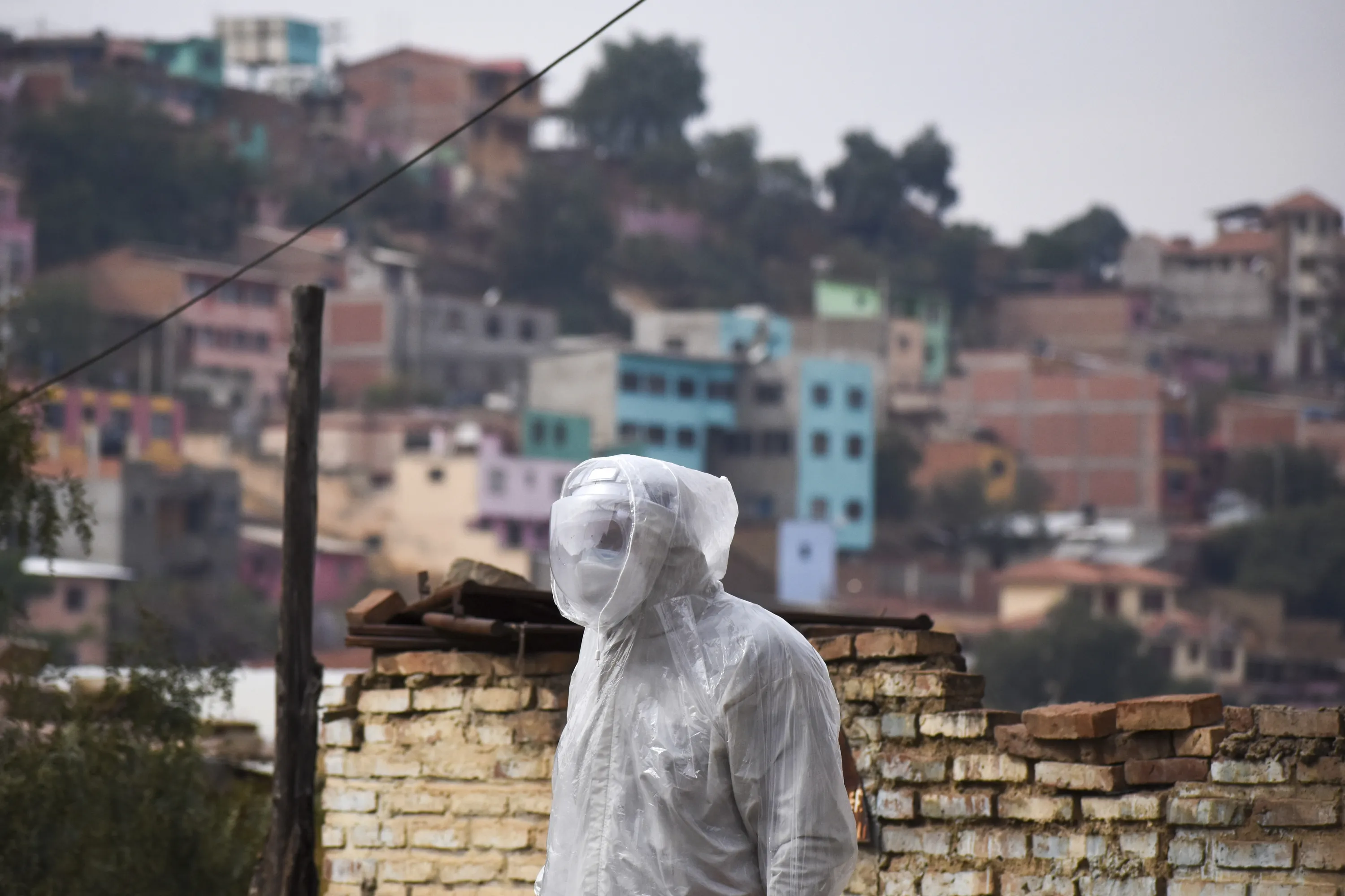 A state department health worker stands in full protective gear while recovering the body of a street vendor who was found at dawn by his neighbors in the Cerro San Miguel neighborhood of Cochabamba, Bolivia, Saturday, July 25, 2020. As part of a government mandated protocol to curb the spread of the new coronavirus, health officials are being called on to disinfect and take COVID-19 rapid tests from the increasing number of bodies they are called on to collect, regardless on whether they are known to have been infected with the virus. (Photo by Dico Solis/AP Photo)
