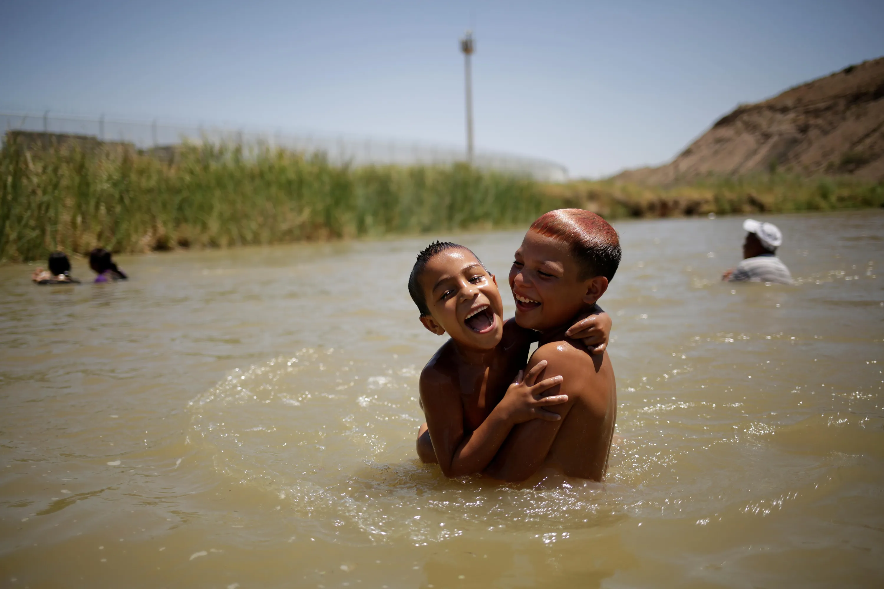 Children cool off during a hot day on the Mexican side of the Rio Bravo near the fence marking the border between Mexico and the U.S, as pictured from Ciudad Juarez, Mexico, July 15, 2020. (Photo by Jose Luis Gonzalez/Reuters)
