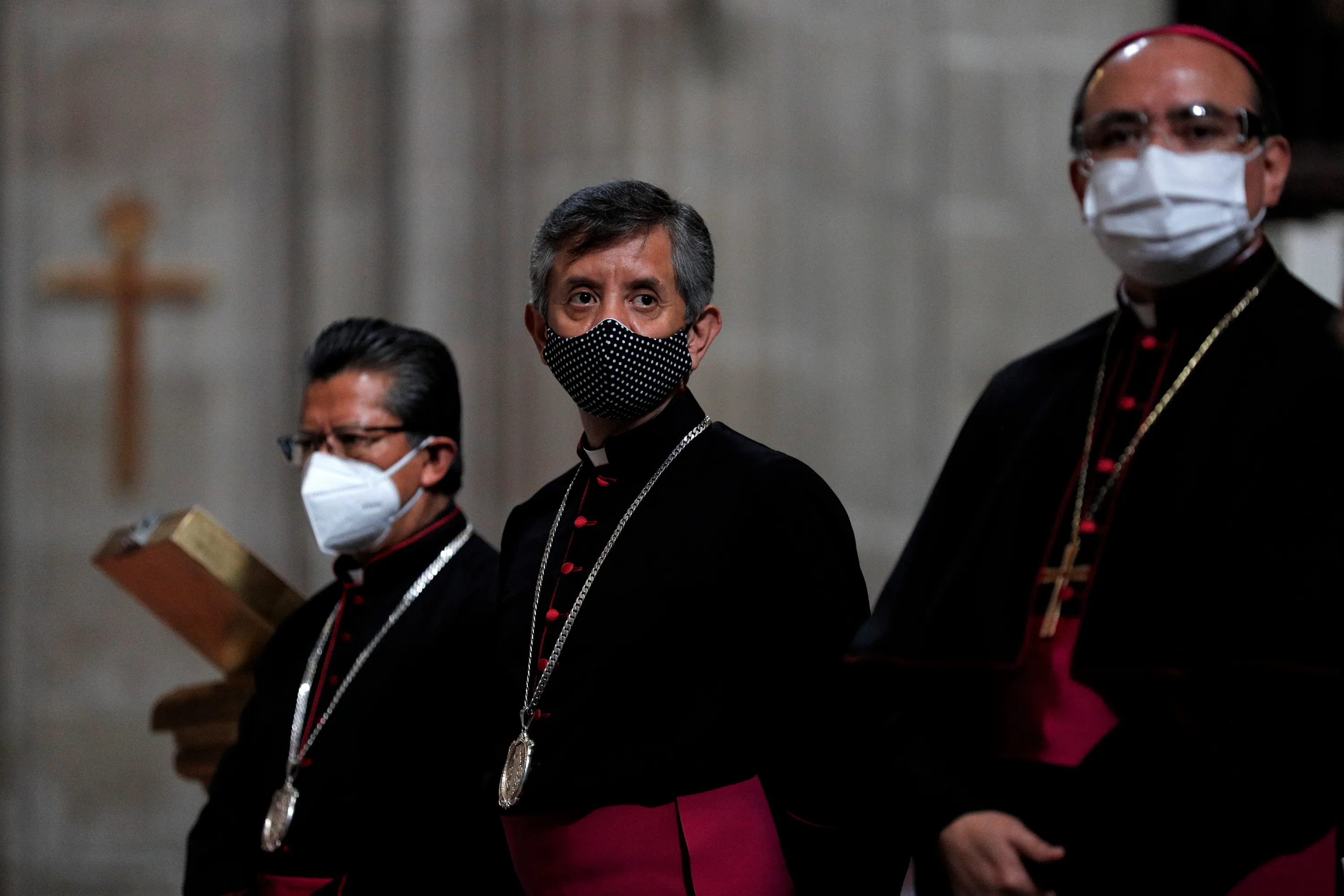 Catholic priests stand inside the Metropolitan Cathedral ahead of the first Mass open to the public amidst the ongoing coronavirus pandemic, in Mexico City, Sunday, July 26, 2020. (Photo by Rebecca Blackwell/AP Photo)