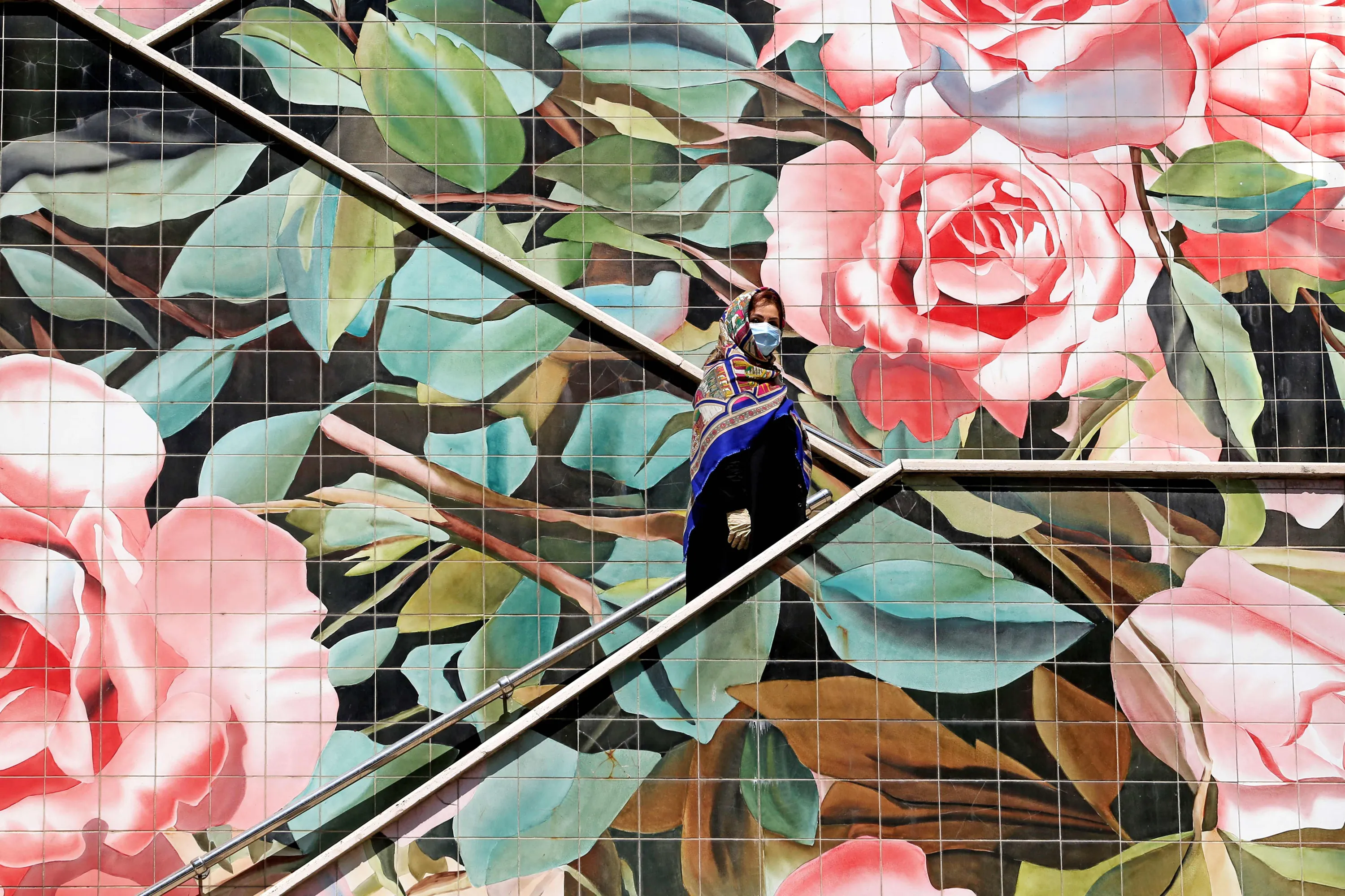 An Iranian woman wearing a protective mask due to the COVID-19 pandemic, climbs up a decorated stairway in the capital Tehran, on July 14, 2020. (Photo by Atta Kenare/AFP Photo)