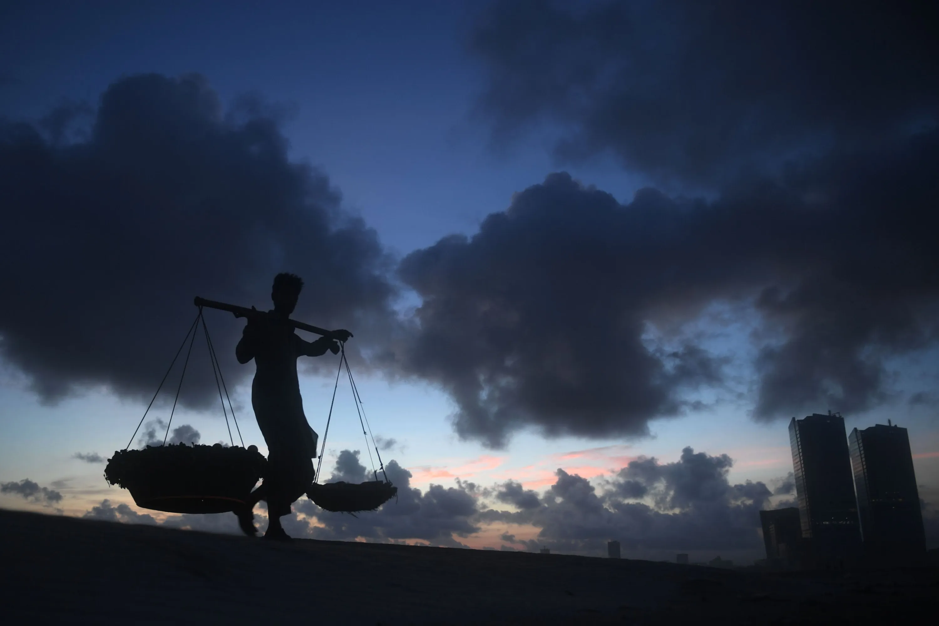 A fruit vendor walks as people gather at Sea View Beach violating government bans imposed as a preventive measure to stop the spread of the COVID-19 coronavirus, in Karachi on July 19, 2020. (Photo by Asif Hassan/AFP Photo)