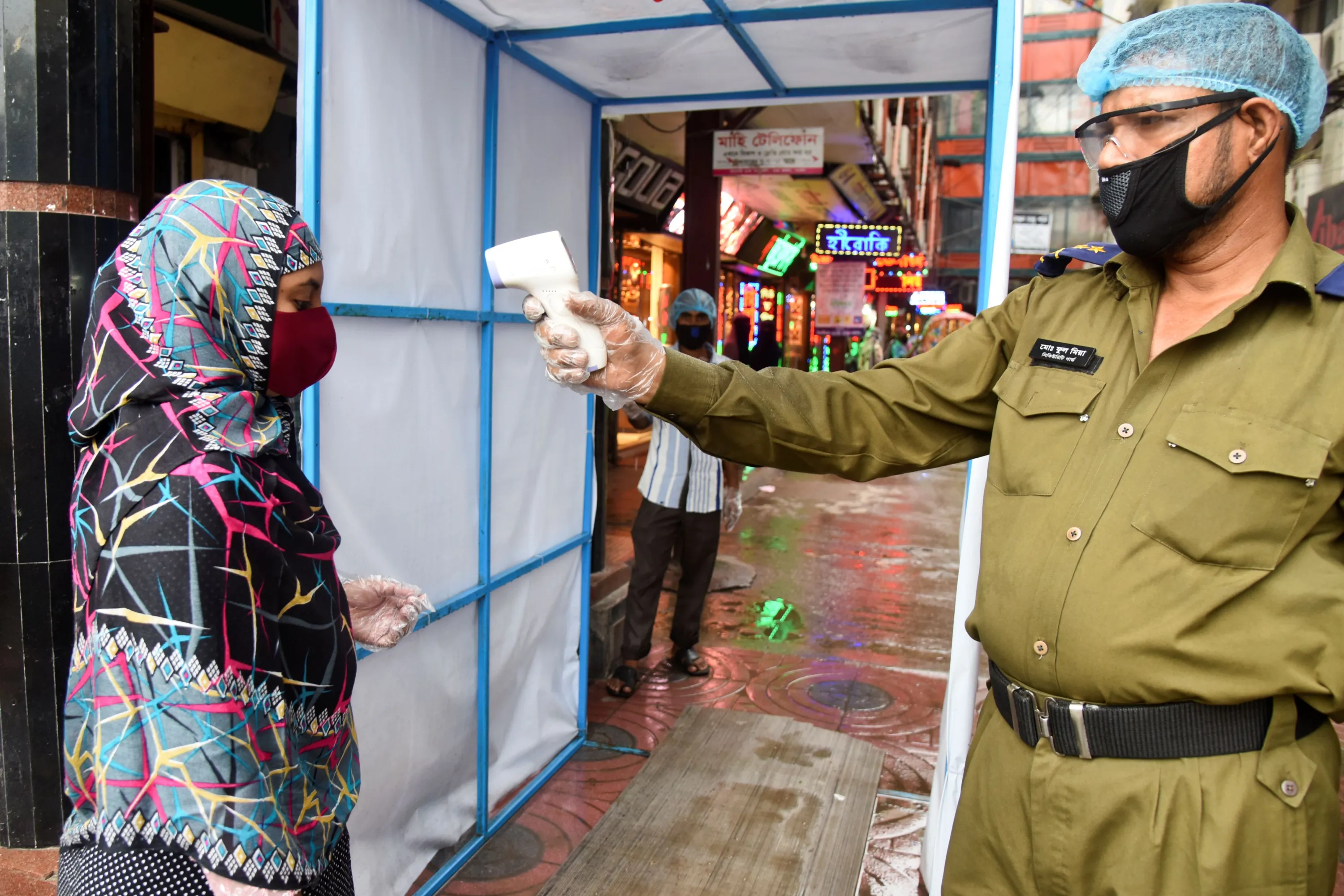 A security personal checks the body temperature of a shopper at the entrance of a shopping mall during the coronavirus outbreak in Dhaka, Bangladesh, on June 28, 2020 (Photo by Mamunur Rashid/NurPhoto via Getty Images)