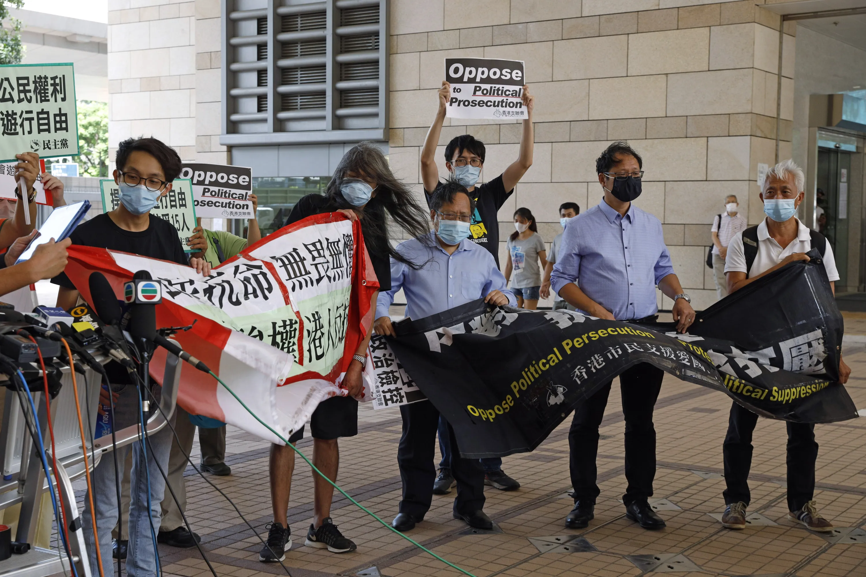 Pro-democracy activists including Leung Kwok-hung, second left, hold banners outside a district court in Hong Kong, Thursday, July 30, 2020. Activists including Lai who organized the June 4th Tiananmen massacre memorial this year, which was banned by police because of anti-virus social distancing reasons, appeared in a Hong Kong court on Monday on charges of inciting others to participate in an unlawful assembly. (Photo by Kin Cheung/AP Photo)